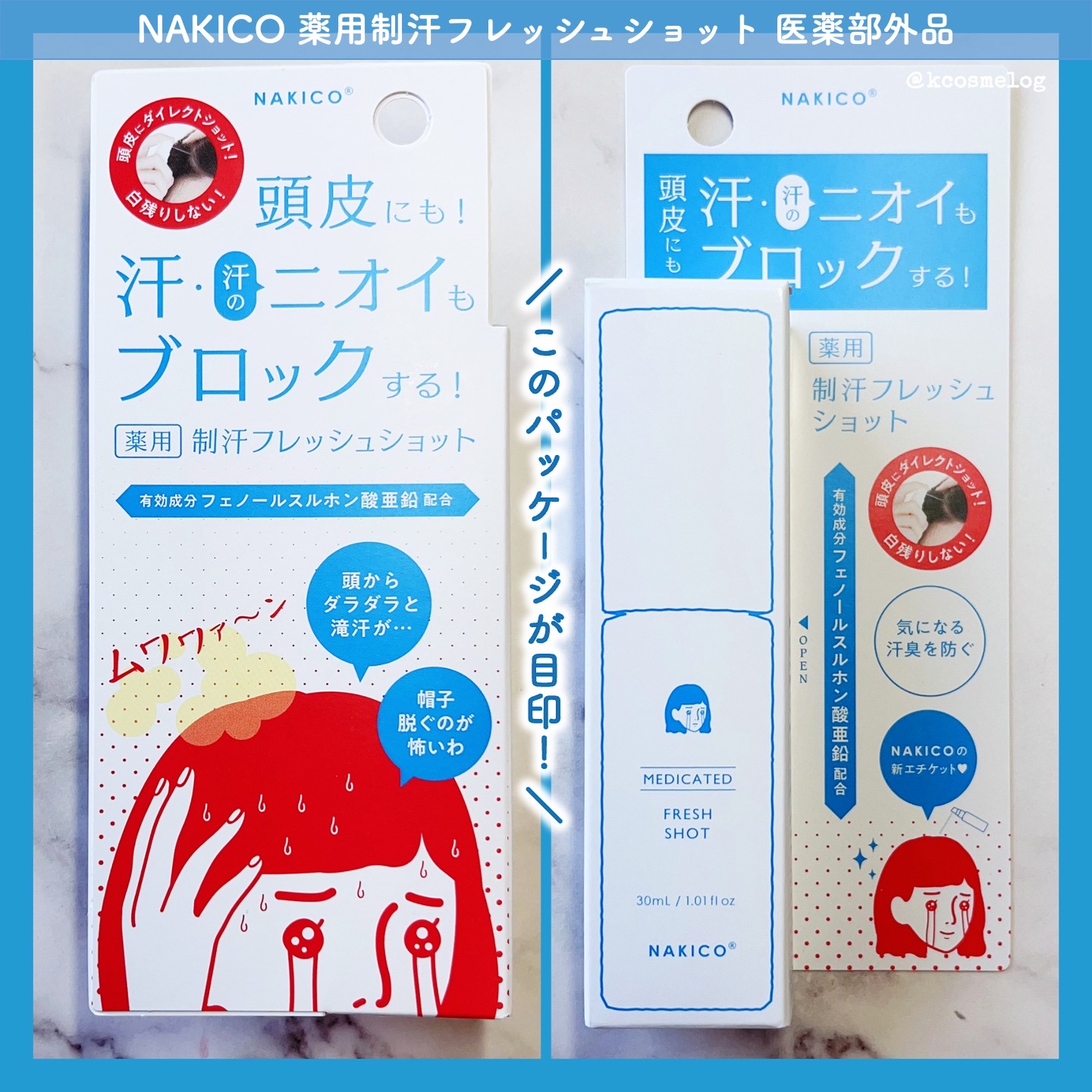 - 【医薬部外品】 日常の生活シーンでの気になる頭まわりのニオイや汗問題に着目。NAKICOの新作「薬用制汗フレッシュショット」はフェノールスルホン酸亜鉛とイソプロピルメチルフェノールのW主剤*配合の制汗ミストです。直接肌に届きやすいダイレクトノズル採用で使いやすい設計。メントール配合で清涼感もプラス。フレッシュグレープフルーツの爽やかな香り。 有効成分:フェノールスルホン酸亜鉛、シメン-5-オール