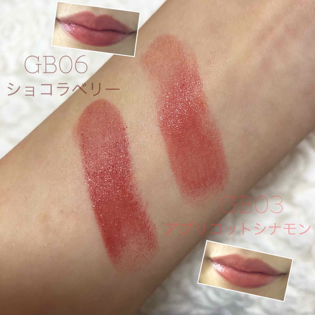 - <GB03 アプリコットシナモン> リンゴ酸ジイソステアリル、テトラエチルヘキサン酸ペンタエリスリチル、トリイソステアリン酸ポリグリセリル-2、水添ポリイソブテン、ヒドロキシアルキル(C16-18)ヒドロキシダイマージリノレイルエーテル、ワセリン、ポリエチレン、キャンデリラロウエステルズ、マイクロクリスタリンワックス、水添ポリデセン、アルガニアスピノサ核油、セラミドEOP、セラミドNG、セラミドNP、セラミドAP、水添レシチン、ダイズステロール、(HDI/トリメチロールヘキシルラクトン)クロスポリマー、カプリル酸グリセリル、トコフェロール、硫酸Ba、(+/-) シリカ、ラウロイルリシン、黄4、黄5、酸化チタン、酸化鉄、水酸化Al、青1、赤104(1)、赤201、赤202 <GB06 ショコラベリー> テトラエチルヘキサン酸ペンタエリスリチル、リンゴ酸ジイソステアリル、トリイソステアリン酸ポリグリセリル-2、水添ポリイソブテン、ヒドロキシアルキル(C16-18)ヒドロキシダイマージリノレイルエーテル、ワセリン、ポリエチレン、キャンデリラロウエステルズ、マイクロクリスタリンワックス、水添ポリデセン、アルガニアスピノサ核油、セラミドEOP、セラミドNG、セラミドNP、セラミドAP、水添レシチン、ダイズステロール、(HDI/トリメチロールヘキシルラクトン)クロスポリマー、カプリル酸グリセリル、トコフェロール、硫酸Ba、シリカ、ラウロイルリシン、黄4、黄5、酸化チタン、酸化鉄、水酸化Al、青1、赤201、赤202 <GB08 シークレットモカ> リンゴ酸ジイソステアリル、テトラエチルヘキサン酸ペンタエリスリチル、トリイソステアリン酸ポリグリセリル-2、水添ポリイソブテン、ヒドロキシアルキル(C16-18)ヒドロキシダイマージリノレイルエーテル、ワセリン、ポリエチレン、キャンデリラロウエステルズ、マイクロクリスタリンワックス、水添ポリデセン、アルガニアスピノサ核油、セラミドEOP、セラミドNG、セラミドNP、セラミドAP、(HDI/トリメチロールヘキシルラクトン)クロスポリマー、カプリル酸グリセリル、トコフェロール、フィトステロールズ、水添レシチン、硫酸Ba、(+/-) シリカ、ラウロイルリシン、黄4、黄5、酸化チタン、酸化鉄、水酸化Al、青1、赤104(1)、赤201、赤202 <GB09 セピアモーヴ> リンゴ酸ジイソステアリル、テトラエチルヘキサン酸ペンタエリスリチル、トリイソステアリン酸ポリグリセリル-2、水添ポリイソブテン、ヒドロキシアルキル(C16-18)ヒドロキシダイマージリノレイルエーテル、ワセリン、ポリエチレン、キャンデリラロウエステルズ、マイクロクリスタリンワックス、水添ポリデセン、アルガニアスピノサ核油、セラミドEOP、セラミドNG、セラミドNP、セラミドAP、(HDI/トリメチロールヘキシルラクトン)クロスポリマー、カプリル酸グリセリル、トコフェロール、フィトステロールズ、水添レシチン、硫酸Ba、(+/-) シリカ、ラウロイルリシン、黄4、黄5、酸化チタン、酸化鉄、水酸化Al、青1、赤104(1)、赤201、赤202 <GB11 ポメグラネイト> テトラエチルヘキサン酸ペンタエリスリチル、リンゴ酸ジイソステアリル、トリイソステアリン酸ポリグリセリル-2、水添ポリイソブテン、ヒドロキシアルキル(C16-18)ヒドロキシダイマージリノレイルエーテル、ワセリン、ポリエチレン、キャンデリラロウエステルズ、マイクロクリスタリンワックス、水添ポリデセン、アルガニアスピノサ核油、セラミドEOP、セラミドNG、セラミドNP、セラミドAP、(HDI/トリメチロールヘキシルラクトン)クロスポリマー、カプリル酸グリセリル、トコフェロール、フィトステロールズ、水添レシチン、硫酸Ba、(+/-) シリカ、ラウロイルリシン、黄4、黄5、酸化チタン、酸化鉄、水酸化Al、青1、赤201、赤202 <GB12 ホットカラメル> リンゴ酸ジイソステアリル、テトラエチルヘキサン酸ペンタエリスリチル、トリイソステアリン酸ポリグリセリル-2、水添ポリイソブテン、ヒドロキシアルキル(C16-18)ヒドロキシダイマージリノレイルエーテル、ワセリン、ポリエチレン、キャンデリラロウエステルズ、マイクロクリスタリンワックス、水添ポリデセン、アルガニアスピノサ核油、セラミドEOP、セラミドNG、セラミドNP、セラミドAP、(HDI/トリメチロールヘキシルラクトン)クロスポリマー、カプリル酸グリセリル、トコフェロール、フィトステロールズ、水添レシチン、硫酸Ba、(+/-) シリカ、ラウロイルリシン、黄4、黄5、酸化チタン、酸化鉄、水酸化Al、青1、赤104(1)、赤201、赤202 <GB01 レッドガーネット> リンゴ酸ジイソステアリル、テトラエチルヘキサン酸ペンタエリスリチル、トリイソステアリン酸ポリグリセリル-2、水添ポリイソブテン、ヒドロキシアルキル(C16-18)ヒドロキシダイマージリノレイルエーテル、ワセリン、ポリエチレン、キャンデリラロウエステルズ、マイクロクリスタリンワックス、水添ポリデセン、アルガニアスピノサ核油、セラミドEOP、セラミドNG、セラミドNP、セラミドAP、水添レシチン、ダイズステロール、(HDI/トリメチロールヘキ
