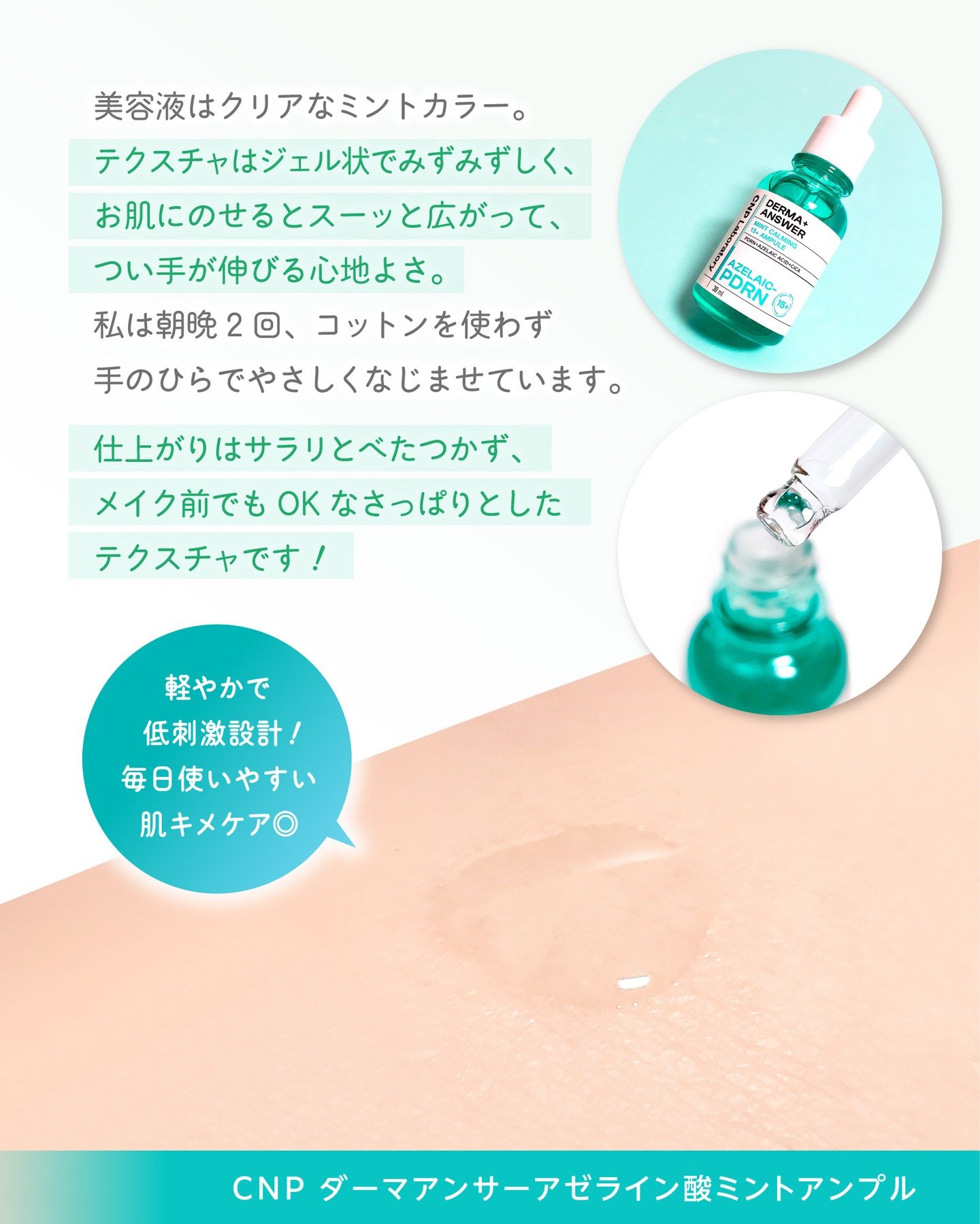 アゼライン酸+PDRNの高配合ソリューションで肌トラブルの原因を根本から除去し、再発防止及びほんの3秒でスピード鎮静が可能なアンプル。 綺麗なエメラルドグリーンが涼やかな見た目。サラッとして使いやすい使用感。 ニキビや毛穴ケアにおすすめです。
