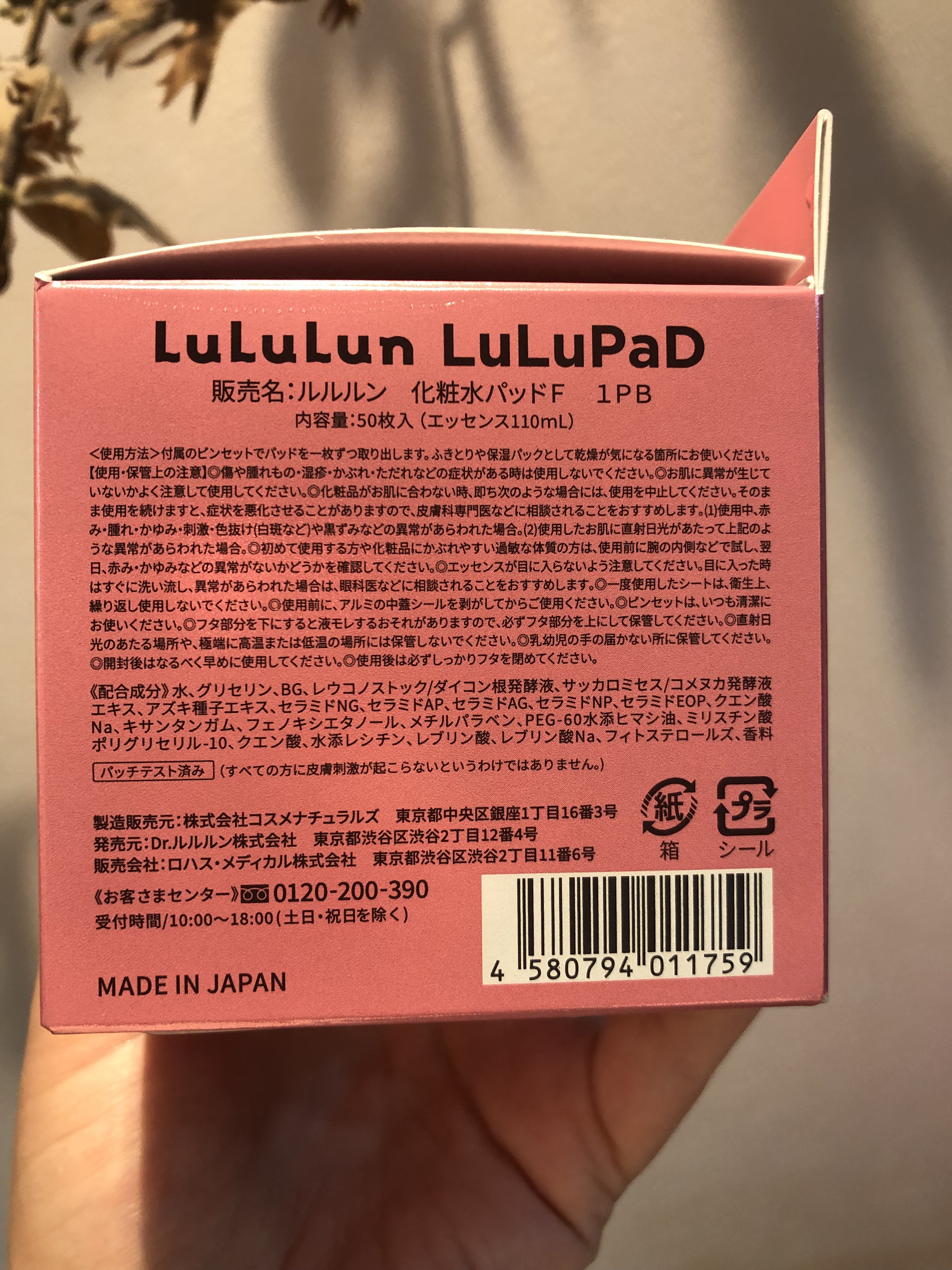 - <ルルルン トナーパッド うるおいON> 水、BG、グリセリン、キサンタンガム、フェノキシエタノール、メチルパラベン、香料、セラミドNG、水添レシチン、クエン酸、セラミドNP、PEG-60水添ヒマシ油、セラミドAP、セラミドEOP、ミリスチン酸ポリグリセリル-10、フィトステロールズ、クエン酸Na、レブリン酸、レブリン酸Na、セラミドAG、サッカロミセス/コメヌカ発酵液エキス、アズキ種子エキス、レウコノストック/ダイコン根発酵液