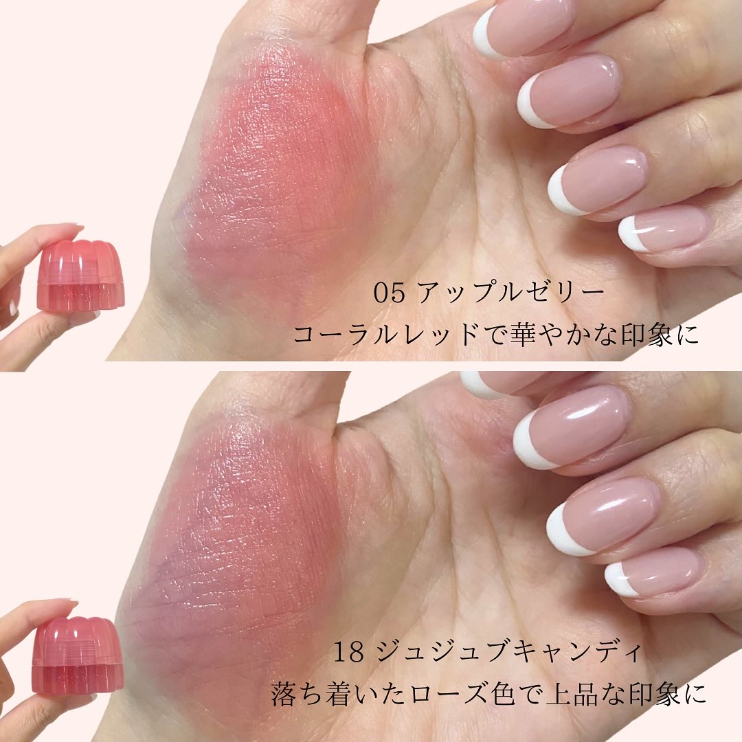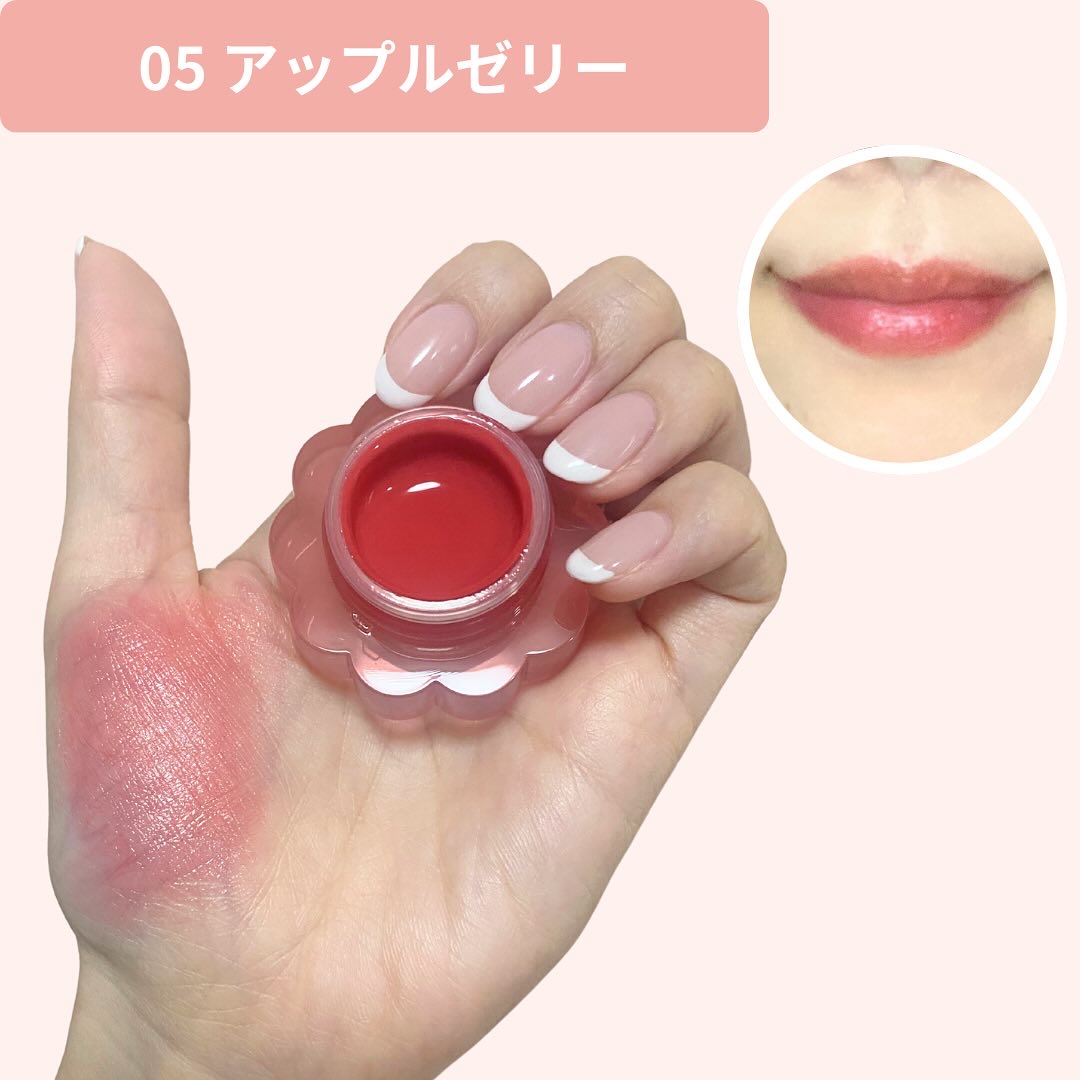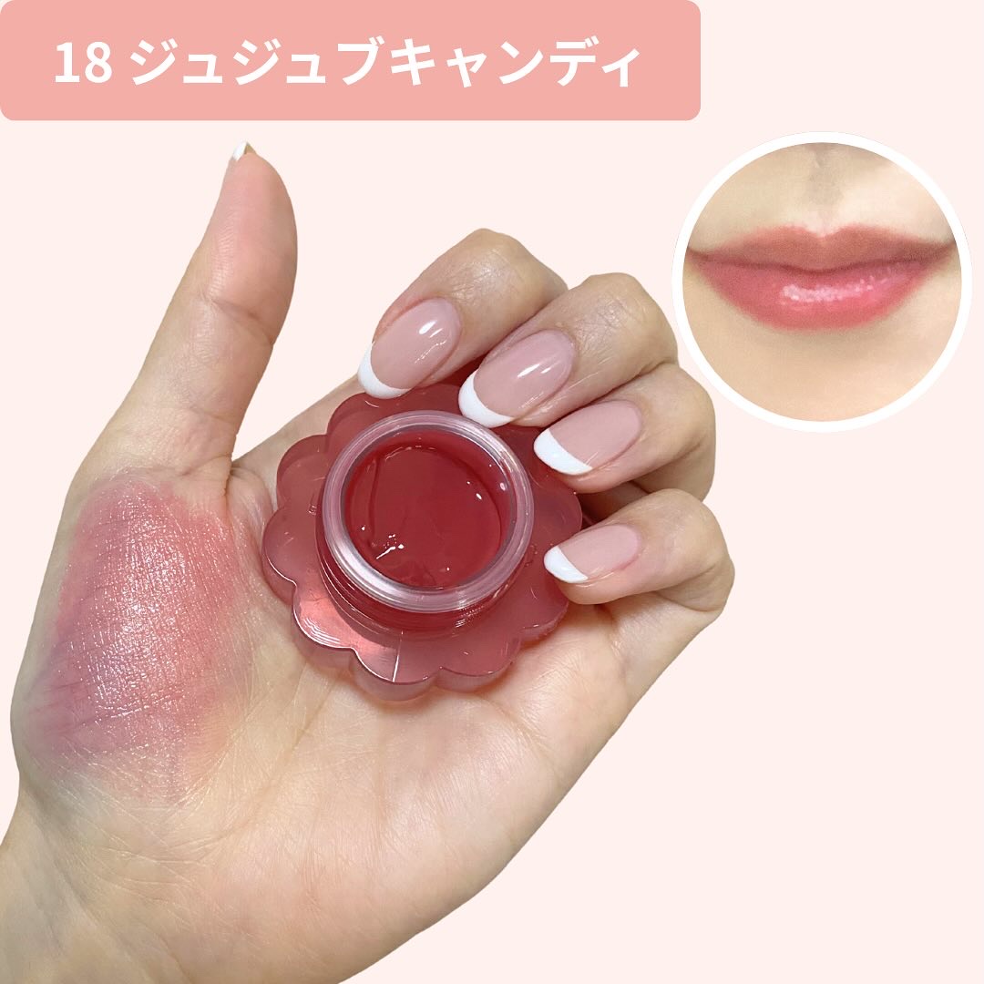 - <01 パパイヤクリーム> 水、ヘキサ(ヒドロキシステアリン酸/ステアリン酸/ロジン酸)ジペンタエリスリチル、トリエチルヘキサノイン、BG、グリセリン、オクチルドデカノール、ポリソルベート60、プロパンジオール、(PEG-240/デシルテトラデセス-20/HDI)コポリマー、1,2-ヘキサンジオール、セテアレス-20、フェノキシエタノール、エチルセルロース、カプリル酸グリセリル、(アクリル酸ヒドロキシエチル/アクリロイルジメチルタウリンNa)コポリマー、トリイソステアリン酸ポリグリセリル-2、リンゴ酸ジイソステアリル、酸化チタン、スクワラン、(アクリレーツ/アクリル酸アルキル(C10-30))クロスポリマー、トロメタミン、香料、エチルヘキシルグリセリン、黄4、赤104(1)、黄5、赤227、エチレンジアミンジコハク酸3Na、イソステアリン酸ソルビタン、ジイソステアリン酸ポリグリセリル-2、リナロール、ラウリン酸K、トコフェロール、青1 <02 ピーチドロップ> 水、ヘキサ(ヒドロキシステアリン酸/ステアリン酸/ロジン酸)ジペンタエリスリチル、トリエチルヘキサノイン、BG、グリセリン、オクチルドデカノール、ポリソルベート60、プロパンジオール、(PEG-240/デシルテトラデセス-20/HDI)コポリマー、1,2-ヘキサンジオール、セテアレス-20、フェノキシエタノール、リンゴ酸ジイソステアリル、酸化チタン、エチルセルロース、カプリル酸グリセリル、(アクリル酸ヒドロキシエチル/アクリロイルジメチルタウリンNa)コポリマー、トリイソステアリン酸ポリグリセリル-2、スクワラン、(アクリレーツ/アクリル酸アルキル(C10-30))クロスポリマー、トロメタミン、香料、エチルヘキシルグリセリン、黄5、赤104(1)、赤227、黄4、エチレンジアミンジコハク酸3Na、イソステアリン酸ソルビタン、ジイソステアリン酸ポリグリセリル-2、青1、リナロール、ラウリン酸K、トコフェロール <03 ハニーマンゴ> 水、ヘキサ(ヒドロキシステアリン酸/ステアリン酸/ロジン酸)ジペンタエリスリチル、トリエチルヘキサノイン、BG、グリセリン、オクチドデカノール、ポリソルベート60、プロパンジオール、(PEG-240/デシルテトラデセス-20/HDI)コポリマー、1,2-ヘキサンジオール、セテアレス-20、フェノキシエタノール、エチルセルロース、リンゴ酸ジイソステアリル、カプリル酸グリセリル、酸化チタン、(アクリル酸ヒドロキシエチル/アクリロイルジメチルタウリンNa)コポリマー、トリイソステアリン酸ポリグリセリル-2、スクワラン、(アクリレーツ/アクリル酸アルキル(C10-30))クロスポリマー、トロメタミン、香料、エチルヘキシルグリセリン、赤104(1)、黄5、赤227、黄4、エチレンジアミンジコハク酸3Na、イソステアリン酸ソルビタン、ジイソステアリン酸ポリグリセリル-2、リナロール、ラウリン酸K、トコフェロール、青1 <04 ピンクバブル> 水、ヘキサ(ヒドロキシステアリン酸/ステアリン酸/ロジン酸)ジペンタエリスリチル、トリエチルヘキサノイン、BG、グリセリン、オクチドデカノール、ポリソルベート60、プロパンジオール、(PEG-240/デシルテトラデセス-20/HDI)コポリマー、1,2-ヘキサンジオール、セテアレス-20、フェノキシエタノール、エチルセルロース、カプリル酸グリセリル、トリイソステアリン酸ポリグリセリル-2、(アクリル酸ヒドロキシエチル/アクリロイルジメチルタウリンNa)コポリマー、スクワラン、(アクリレーツ/アクリル酸アルキル(C10-30))クロスポリマー、リンゴ酸ジイソステアリル、酸化チタン、トロメタミン、香料、エチルヘキシルグリセリン、赤104(1)、酸化鉄、赤227、エチレンジアミンジコハク酸3Na、ジイソステアリン酸ポリグリセリル-2、黄4、イソステアリン酸ソルビタン、黄5、リナロール、ラウリン酸K、トコフェロール <05 アップルゼリー> 水、ヘキサ(ヒドロキシステアリン酸/ステアリン酸/ロジン酸)ジペンタエリスリチル、トリエチルヘキサノイン、BG、グリセリン、オクチドデカノール、ポリソルベート60、プロパンジオール、(PEG-240/デシルテトラデセス-20/HDI)コポリマー、1,2-ヘキサンジオール、セテアレス-20、フェノキシエタノール、トリイソステアリン酸ポリグリセリル-2、エチルセルロース、カプリル酸グリセリル、(アクリル酸ヒドロキシエチル/アクリロイルジメチルタウリンNa)コポリマー、スクワラン、(アクリレーツ/アクリル酸アルキル(C10-30))クロスポリマー、トロメタミン、香料、リンゴ酸ジイソステアリル、酸化チタン、エチルヘキシルグリセリン、赤227、黄5、赤104(1)、黄4、エチレンジアミンジコハク酸3Na、ジイソステアリン酸ポリグリセリル-2、イソステアリン酸ソルビタン、リナロール、ラウリン酸K、トコフェロール、青1 <06 クアバキャンディ> 水、ヘキサ(ヒドロキシステアリン酸/ステアリン酸/ロジン酸)ジペンタエリスリチル、トリエチルヘキサノイン、BG、グリセリン、オクチドデカノール、ポリソルベート60、プロパンジオール、(PEG-240/デシルテトラデセス-20/HDI)コポリマー、1,2-ヘキサンジオール、セテアレス-20、フェノ