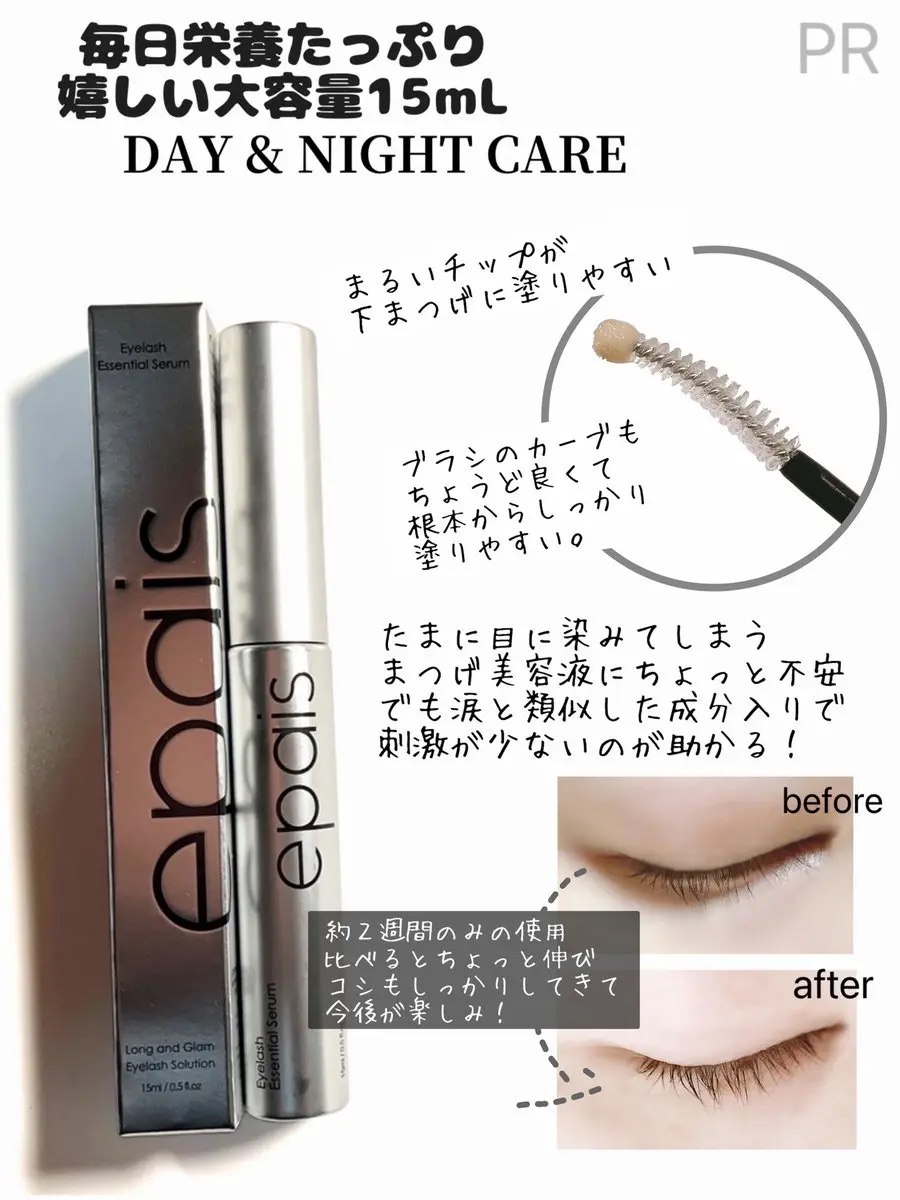 24時間まつ毛ケア!おすすめまつ毛美容液紹介✨大容量×高濃度×低刺激👀epais☀️朝は「ブラックセラム」でメイクしながらまつ毛ケア🌙夜は「エッセンシャルセラム」で濃密栄養チャージエッセンシャルセラムは✔️15mlの大容量で3ヶ月以上使える✔...