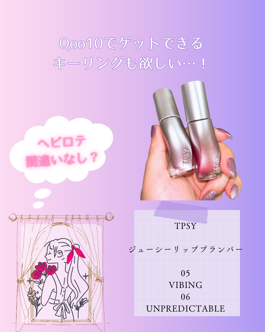ふっくらちゅるん.🫦痛くないプランパー🍀*゜レイヤリングするほどボリュームUP💗とにかく落ちない!!色持ち👍🏻̖́-水分を含んだコンディショニング成分を79%配合長時間しっとり👄TPSYジューシーリッププランパー6g#5バイビング#6アンプリ...