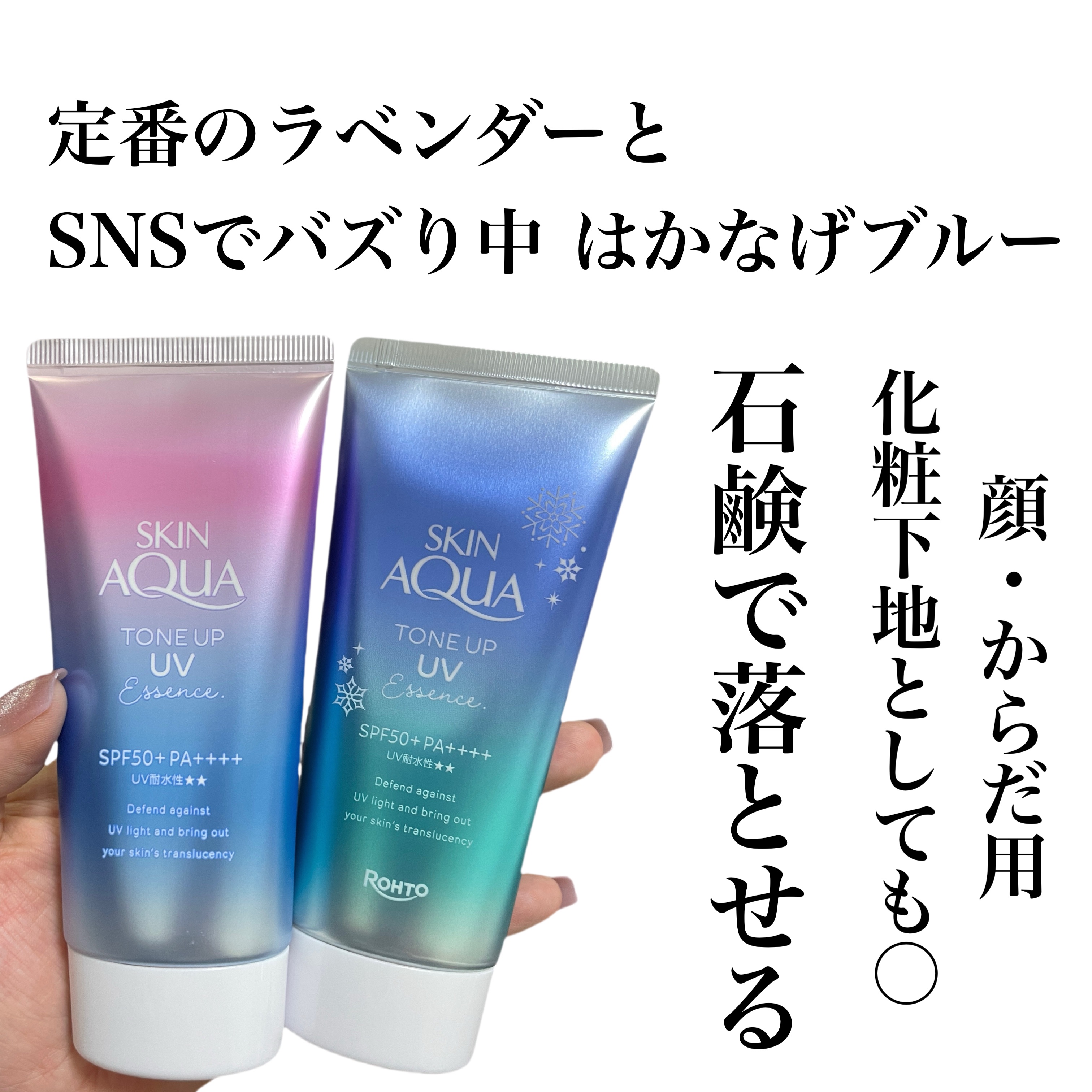 - ※カラー名称「ハピネスオーラ」は「ローズ」へ名称変更となりました。 <ミントグリーン> 赤み補正*1!UVカットしながら、色と光をコントロールし、肌をトーンアップ*1。 ミントグリーンカラーで透き通るような素肌つづく!エッセンスタイプの日焼け止め。 透明感*1のある肌に。 SPF50+、PA++++、UV耐水性★★。 鉱物油フリー。パラベンフリー。ときめくサボンの香り。 <ラベンダー> 明るさ補正*1!UVカットしながら、色と光をコントロールし、肌をトーンアップ*1。 透明感*1を引き出すラベンダーカラーの日焼け止め。 すーっとのびて、みずみずしい使い心地のエッセンスタイプ。 SPF50+、PA++++、UV耐水性★★。 鉱物油フリー。パラベンフリー。ときめくサボンの香り。 <ローズ> 血色感補正*1!UVカットしながら、色と光をコントロールし、肌をトーンアップ*1。 ローズカラーで血色をプラスし、透明感*1のある肌に。 エッセンスタイプの日焼け止め。 SPF50+、PA++++、UV耐水性★★。 パラベンフリー。ハピネスブロッサムの香り。 <ブルー> UVカットしながら、色と光をコントロールし、肌をトーンアップ*1。 血色感を抑えて儚げな色白肌*1に見せるブルーカラーの顔・からだ用日やけ止め。すーっとのびて、みずみずしい使い心地。 透明感ブルー×透明感ホワイト=はかなげブルーカラーで、自分史上最高*2の色白肌*1、うるおう美容液成分(うるおい成分)としてヒアルロン酸Na、ビタミンC誘導体*3配合。 SPF50+/PA++++。こころがときめくサボンの香り。化粧下地にも。石けんで落とせます。 パラベンフリー。鉱物油フリー。アレルギーテスト済み(全ての方にアレルギーが起こらないというわけではありません)。 *1:メイクアップ効果による *2:スキンアクアシリーズにおいて *3:リン酸アスコルビルMg(うるおい成分)