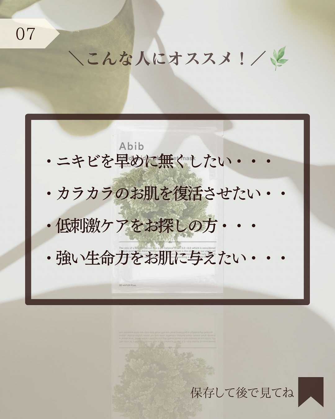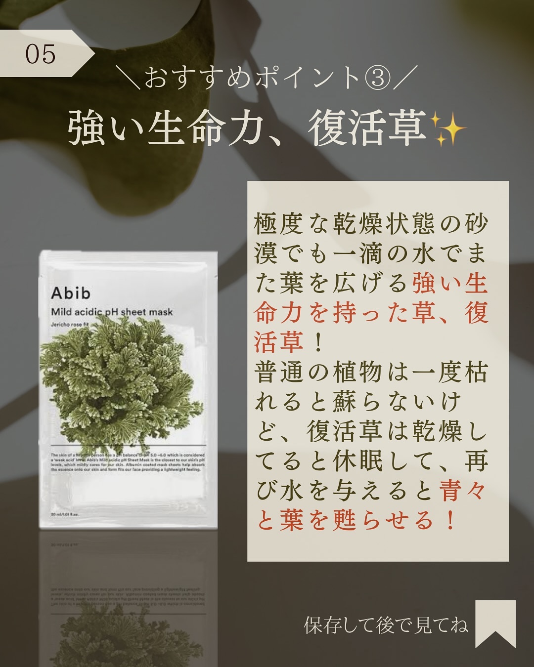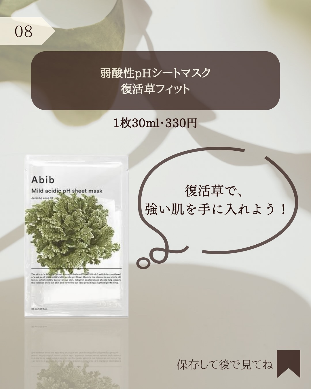 Abib弱酸性PHシートマスク復活草フィット初めて使ったパック保湿系のパックで使い心地が良かった肌荒れしている肌に使っても刺激がなく使えた1枚は高いけど特に乾燥が気になるときに特別ケアとして使っています。このパックは、シリーズがたくさんある...