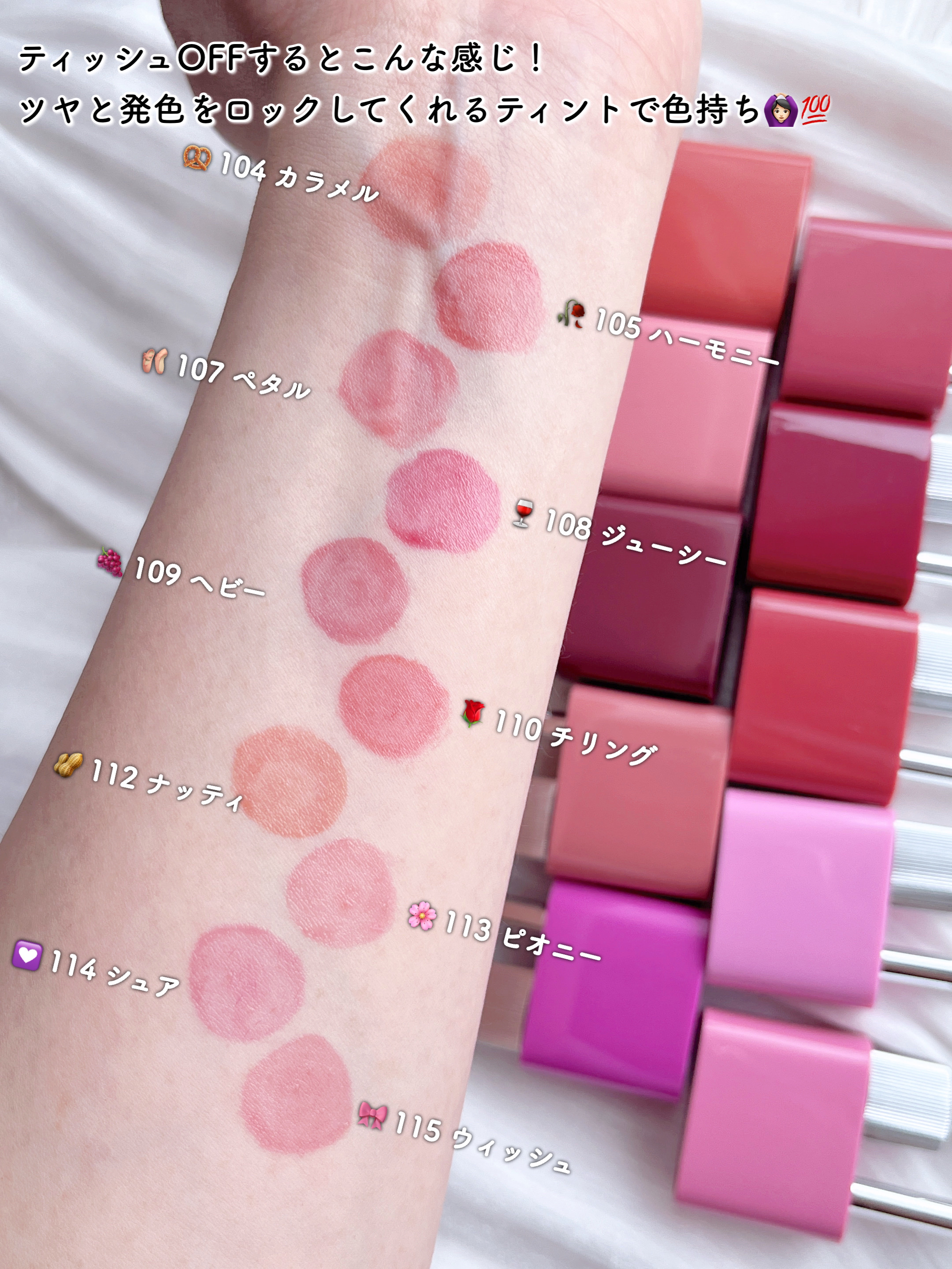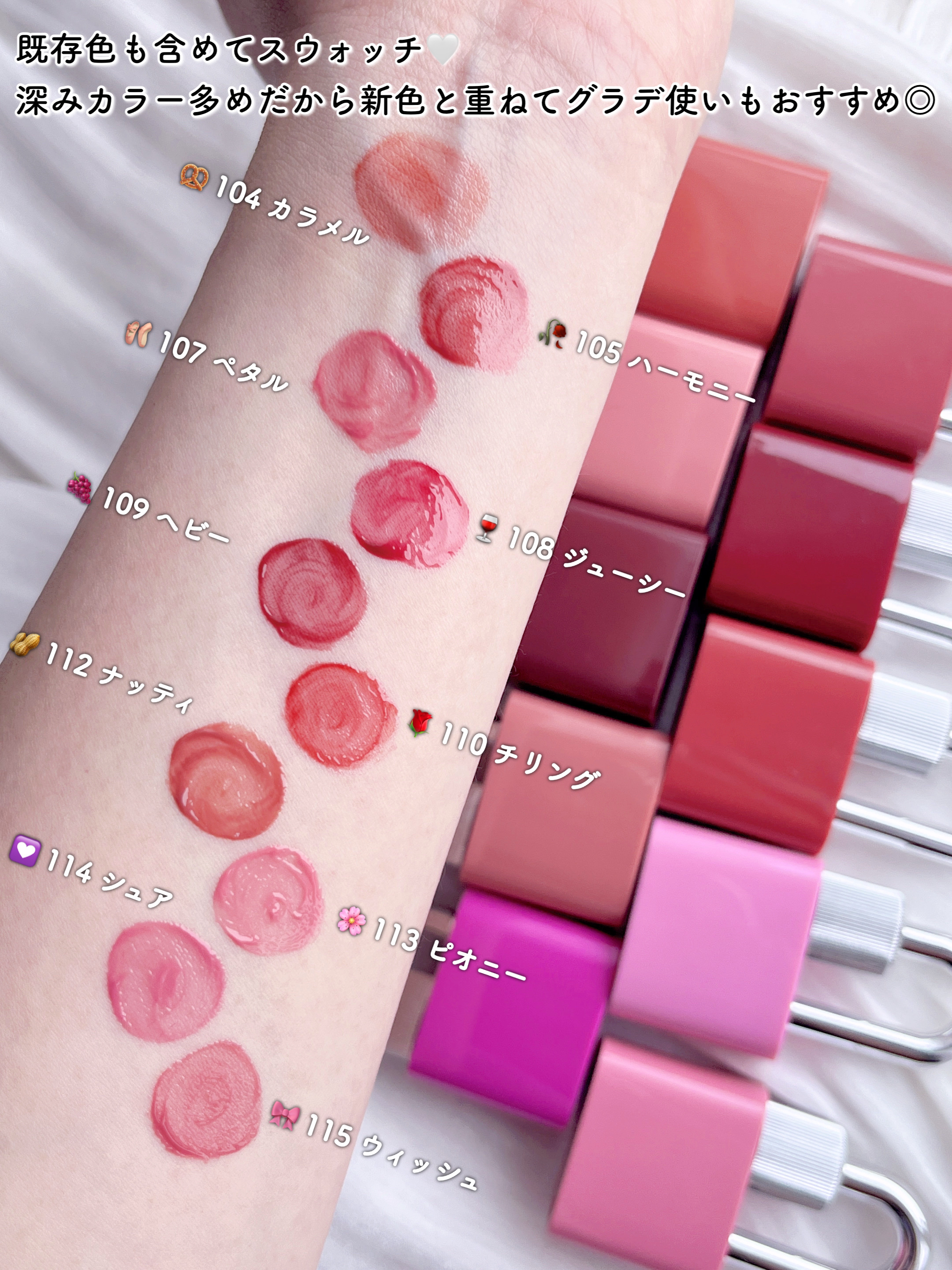 私的に、色持ちの他に'落ち方が綺麗か'もかなり重要視しています🤔 オフィスメイクにも、デートにも、毎日メイクにも使いやすいラインナップです🫰🏻 ブルベのイエベ寄せメイクにも💯