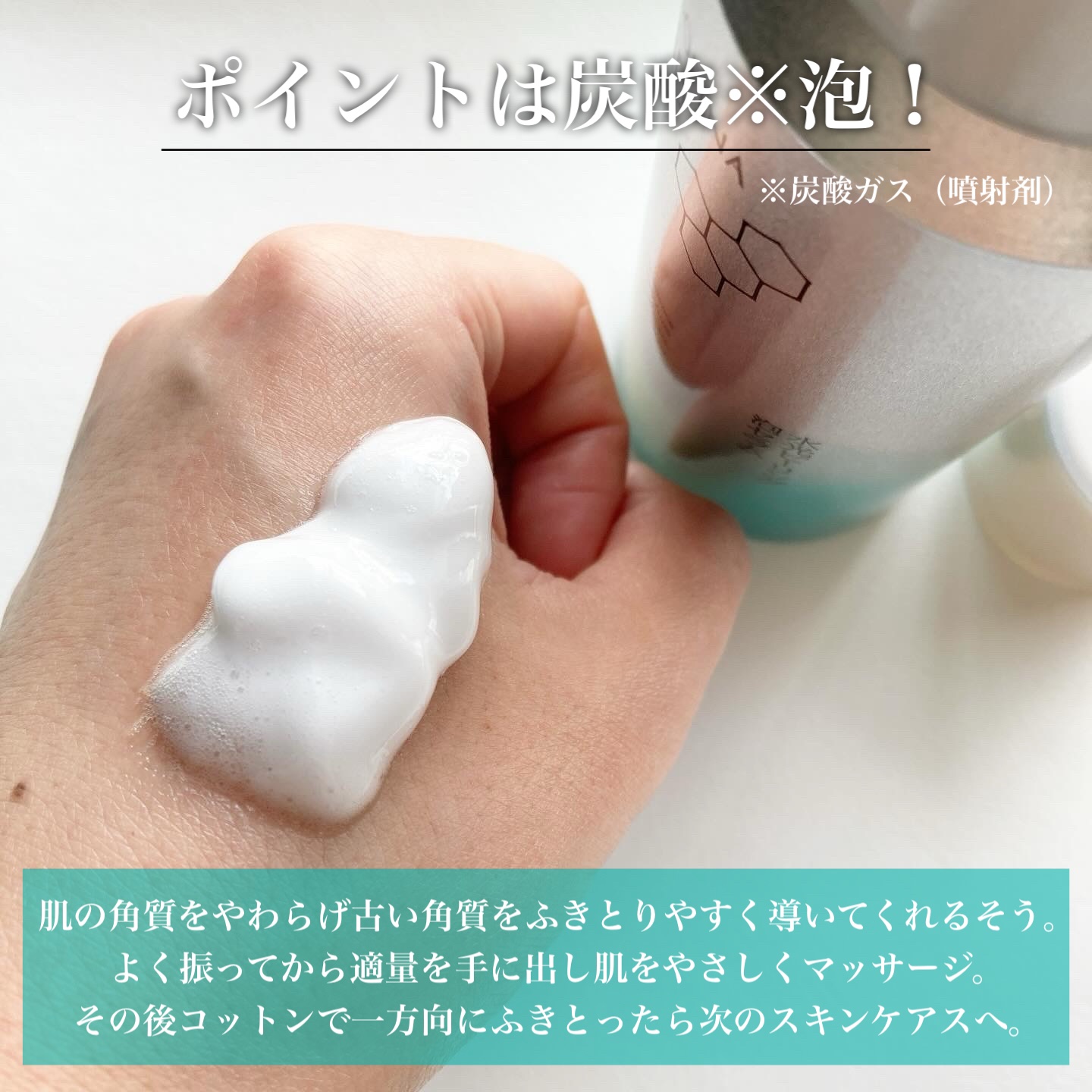 - ふきとって、明るさ、つや感、うるおいまで感じる炭酸*1 泡のピーリング美容液です。 独自開発処方により、濃密炭酸*1 泡が肌の上でとろけて肌に密着。 古い角質をふきとり、うるおいを与え、つるんと透明感のある水光肌に導きます。 ●角層クリア成分*5(保湿)配合 ●ケラトTR複合成分*6(保湿)配合 ●ノンコメドジェニックテスト済み ●アレルギーテスト済み ●肌が敏感な方*7 の協力によるパッチテスト済み*8 *1 炭酸ガス(噴射剤) *5 乳酸桿菌/セイヨウナシ果汁発酵液、ハイビスカス花エキス、BG *6 アミジノプロリン、コハク酸ジグリコールグアニジン、ユーカリ葉エキス、BG *7 環境や体調などによって化粧品が一時的に合わなくなる方 *8 皮膚に対する刺激性を確認するテストです ※すべての方にコメド(にきびのもと)ができない、アレルギーや皮膚刺激が起こらないというわけではありません。