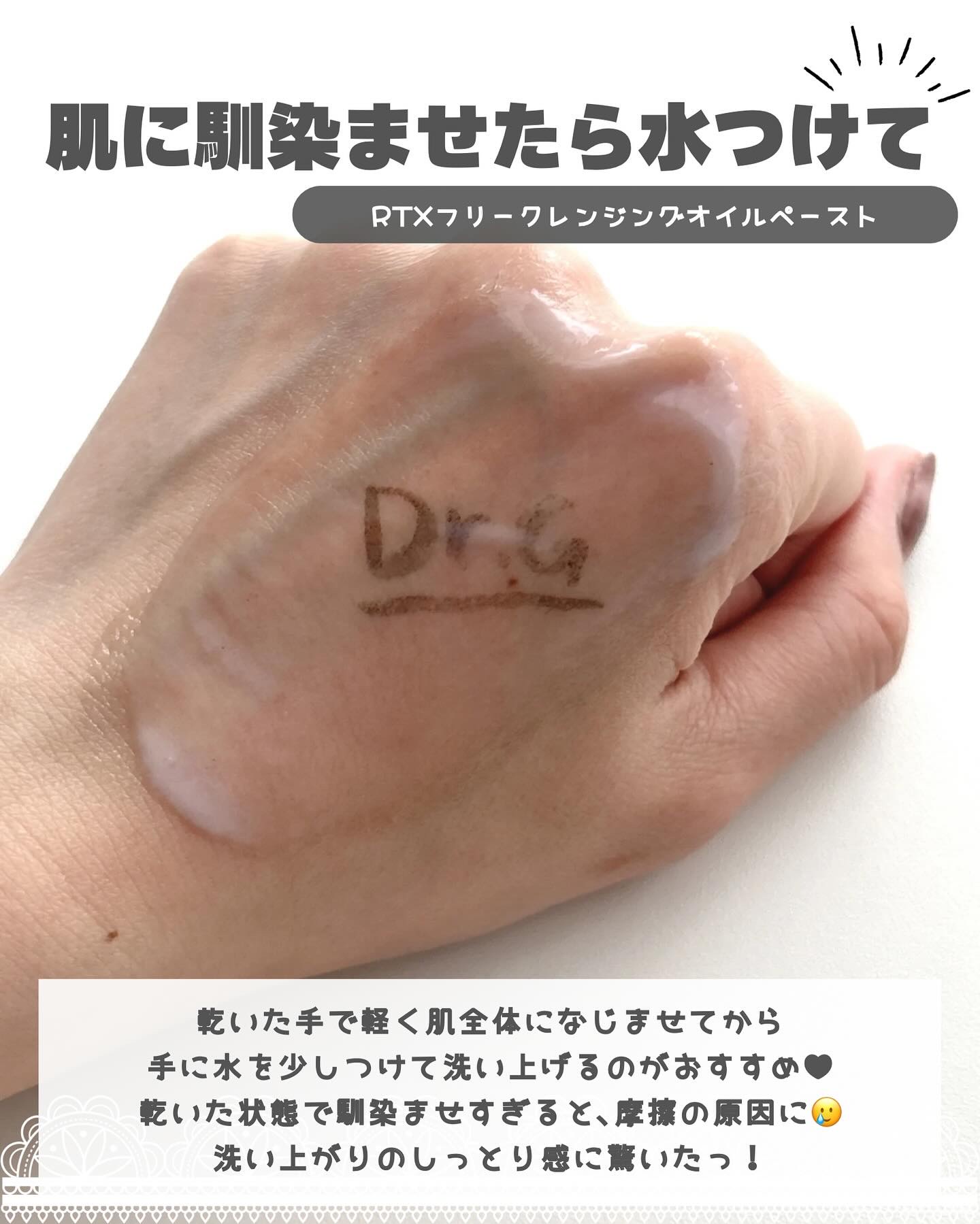 もっちりとしたジェル状で乳化させるとオイルに。 少し固さがあるから通常よりやや多めに使わないと伸ばしにくさはあるものの、厚めに塗って1~2分おいてから流すとしっとり感アップ! 毛穴のつまりにも届いてくれそうな使用感。 ウォータープルーフなどの落ちにくいものは別で落としておいた方が良いです。 Dr.GのRTXフリークレンジングオイルペーストは新商品です。