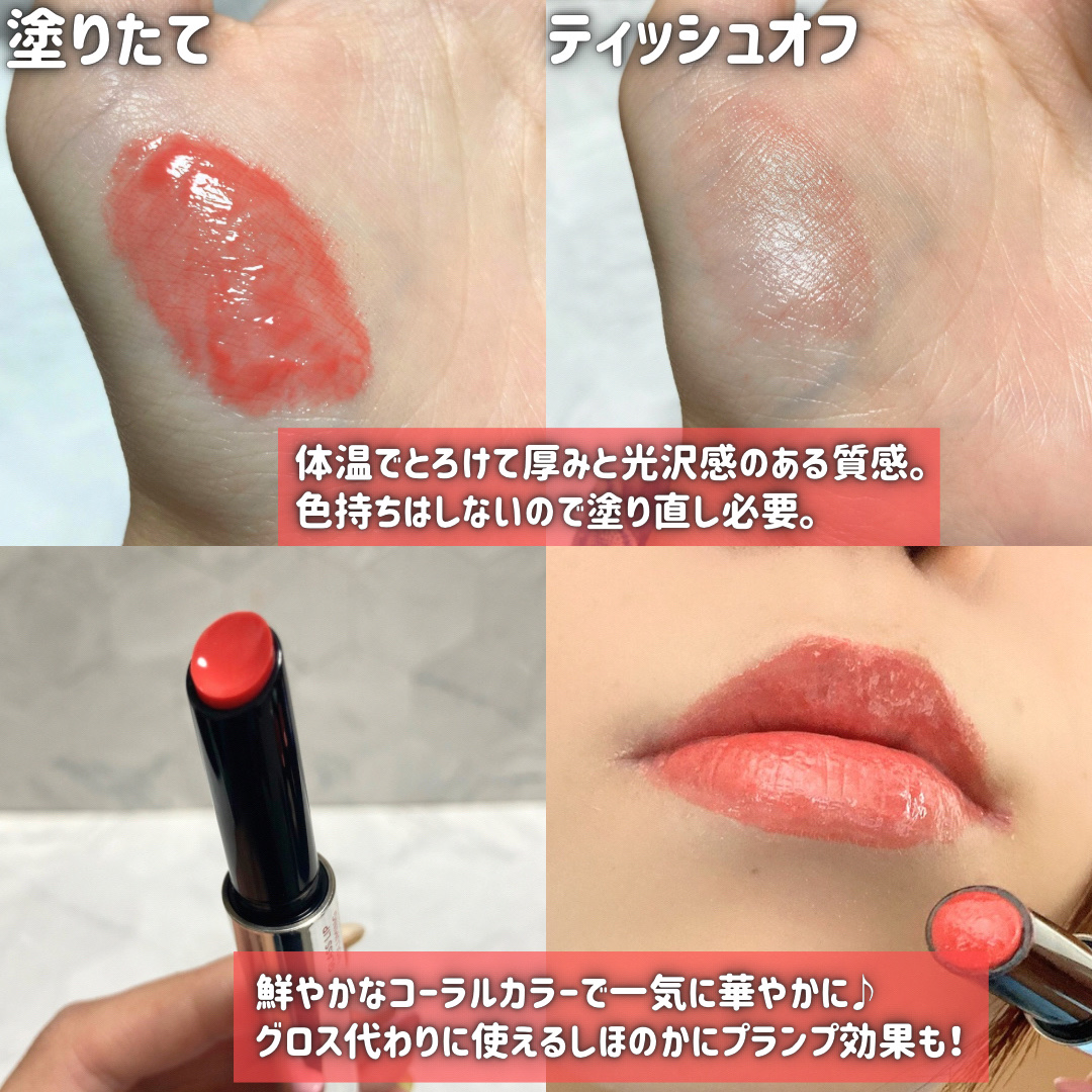 | 口紅・グロス・リップライナーランキング第147位 | 溶けるとオイルっぽいテクスチャーなのですが しっとり感がある割にサラッとしていて ベタつかないので使いやすい! | 詳細を見る | ||