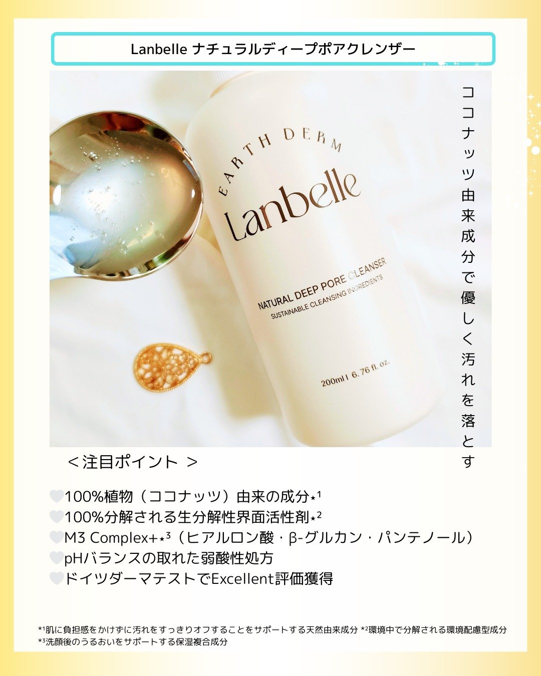 Lanbelleナチュラルディープポアクレンザーココナッツ由来成分と生分解性界面活性剤で肌に負担をかけずに汚れをすっきりオフ!!\𝐩𝐨𝐢𝐧𝐭/①100%植物(ココナッツ)由来の成分を使用②100%分解される環境に優しい生分解性界面活性剤を採用...