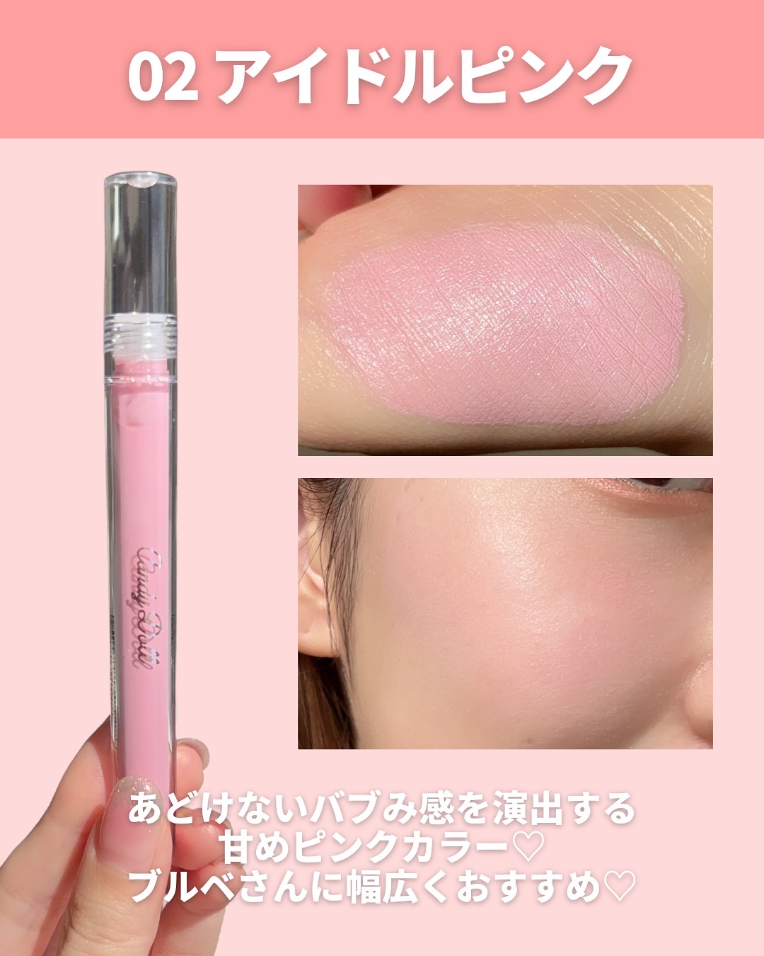 - <01 ヴィーナスラベンダー> 水、イソドデカン、ジメチコン、リンゴ酸ジイソステアリル、(ジメチコン/ビニルジメチコン)クロスポリマー、セチルPEG/PPG-10/1ジメチコン、グリセリン、PG、1,2-ヘキサンジオール、ツボクサエキス、ローズマリー葉エキス、コラーゲンアミノ酸、アボカド油、アマニ油、アルガニアスピノサ核油、オリーブ果実油、ヒマワリ種子油、マカデミア種子油、ヤシ油、ステアリン酸Mg、セチルジメチコン、カプリリルグリコール、酢酸トコフェロール、ソルビン酸K、安息香酸Na、フェノキシエタノール、[+/-]合成フルオロフロゴパイト、酸化チタン、マンガンバイオレット、赤201、赤202、黄4 <02 アイドルピンク> 水、イソドデカン、ジメチコン、リンゴ酸ジイソステアリル、(ジメチコン/ビニルジメチコン)クロスポリマー、セチルPEG/PPG-10/1ジメチコン、グリセリン、PG、1,2-ヘキサンジオール、ツボクサエキス、ローズマリー葉エキス、コラーゲンアミノ酸、アボカド油、アマニ油、アルガニアスピノサ核油、オリーブ果実油、ヒマワリ種子油、マカデミア種子油、ヤシ油、ステアリン酸Mg、セチルジメチコン、カプリリルグリコール、酢酸トコフェロール、ソルビン酸K、安息香酸Na、フェノキシエタノール、[+/-]合成フルオロフロゴパイト、酸化チタン、マンガンバイオレット、赤201、赤202、黄4 <03 チャーミーコーラル> 水、イソドデカン、ジメチコン、リンゴ酸ジイソステアリル、(ジメチコン/ビニルジメチコン)クロスポリマー、セチルPEG/PPG-10/1ジメチコン、グリセリン、PG、1,2-ヘキサンジオール、ツボクサエキス、ローズマリー葉エキス、コラーゲンアミノ酸、アボカド油、アマニ油、アルガニアスピノサ核油、オリーブ果実油、ヒマワリ種子油、マカデミア種子油、ヤシ油、ステアリン酸Mg、セチルジメチコン、カプリリルグリコール、酢酸トコフェロール、ソルビン酸K、安息香酸Na、フェノキシエタノール、[+/-]合成フルオロフロゴパイト、酸化チタン、マンガンバイオレット、赤201、赤202、黄4