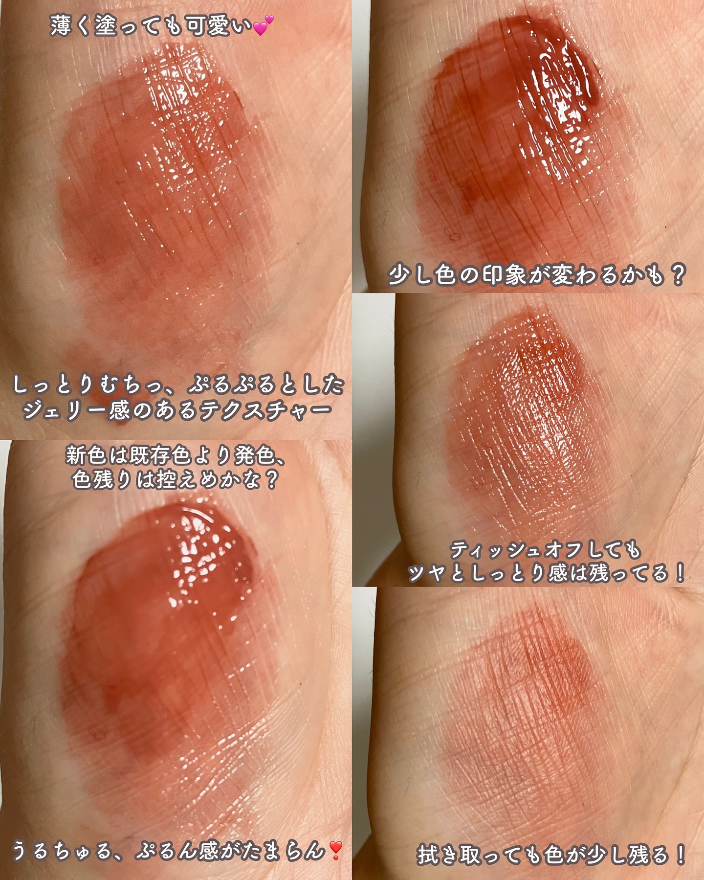 | 中身はゼリーみたいなテクスチャーで ぷるんとしたツヤタイプのティント。 | 詳細を見る | |