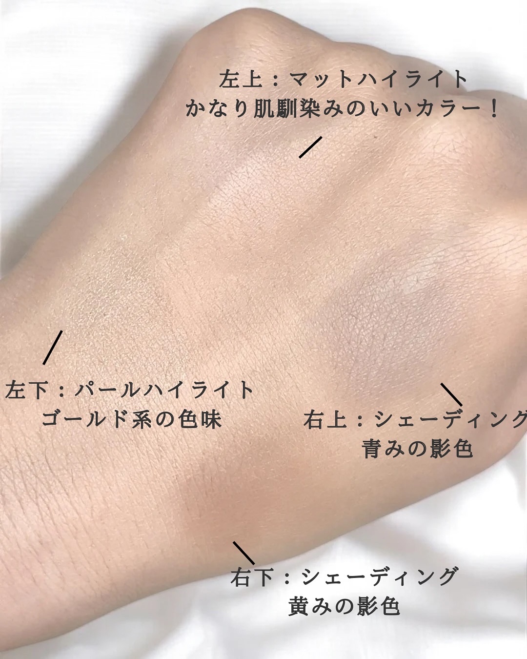 ハイライト毛穴目立たない で、調べてる人←わたし は買う価値あり❣️ このハイライトだけで結構ごまかせてる! 影色も2色入ってるし、 綺麗なハイライトもあるから 毛穴あんま目立たないところは こっちのハイライトを使ったりして、 全色しっかり使えるのも良い❣️