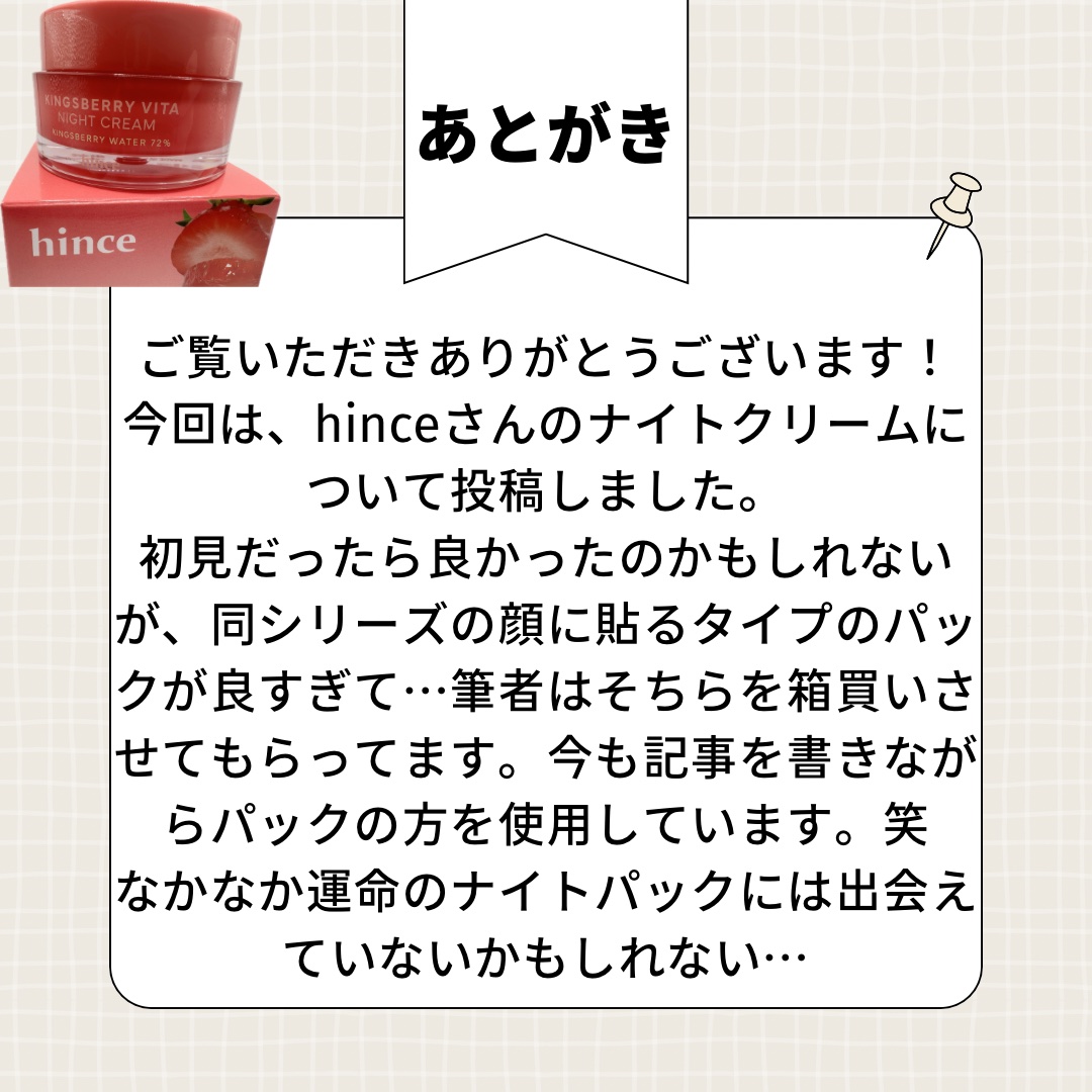 hinceキングスベリービタナイトクリームビタミンと抗酸化成分が豊富※1な「キングスベリー」に着目した、さっと塗って寝るだけで、毎朝の"メイクノリいい"を叶えるナイトクリーム。・肌のトーン※2・キメ・ツヤを集中ケアし、朝のメイクノリがいいグラ...