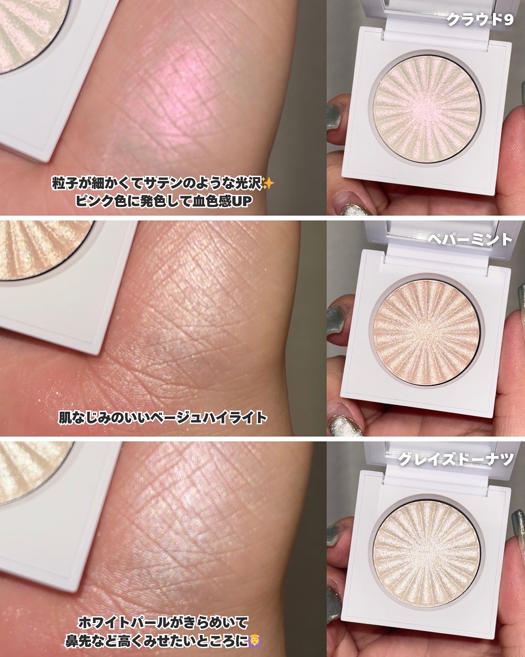 - 【Cloud9】イソドデカン、酸化チタン、マイカ、ジヘプタン酸ネオペンチルグリコール、ステアリン酸亜鉛、タルク、パルミチン酸エチルヘキシル、フェノキシエタノール、エタノール 【Glazed Donut】イソドデカン、マイカ、タルク、酸化チタン、ジヘプタン酸ネオペンチルグリコール、ステアリン酸亜鉛、パルミチン酸エチルヘキシル、フェノキシエタノール、酸化鉄、エタノール、酸化スズ【Pillow Talk】イソドデカン、タルク、マイカ、酸化チタン、ジヘプタン酸ネオペンチルグリコール、ステアリン酸亜鉛、パルミチン酸エチルヘキシル、フェノキシエタノール、酸化鉄、エタノール、赤201、酸化スズ【Star Island】イソドデカン、マイカ、タルク、酸化チタン、ジヘプタン酸ネオペンチルグリコール、ステアリン酸亜鉛、パルミチン酸エチルヘキシル、酸化鉄、フェノキシエタノール、カオリン、石英、エタノール【Peppermint】イソドデカン、マイカ、酸化チタン、ジヘプタン酸ネオペンチルグリコール、タルク、ステアリン酸亜鉛、パルミチン酸エチルヘキシル、酸化鉄、フェノキシエタノール、カオリン、石英、エタノール【Sugar Cookie】イソドデカン、マイカ、酸化チタン、ジヘプタン酸ネオペンチルグリコール、タルク、ステアリン酸亜鉛、パルミチン酸エチルヘキシル、酸化鉄、フェノキシエタノール、石英、カオリン、エタノール【Space Baby】 イソドデカン、マイカ、酸化チタン、ジヘプタン酸ネオペンチルグリコール、ステアリン酸亜鉛、タルク、パルミチン酸エチルヘキシル、フェノキシエタノール、エタノール 【Out of This World】 イソドデカン、酸化チタン、マイカ、ジヘプタン酸ネオペンチルグリコール、ステアリン酸亜鉛、パルミチン酸エチルヘキシル、タルク、フェノキシエタノール、酸化スズ、エタノール 【Rodeo Drive】 イソドデカン、マイカ、タルク、酸化チタン、ステアリン酸亜鉛、ジヘプタン酸ネオペンチルグリコール、パルミチン酸エチルヘキシル、酸化鉄、フェノキシエタノール、酸化スズ、エタノール、赤202【Bali】イソドデカン、タルク、マイカ、酸化チタン、ジヘプタン酸ネオペンチルグリコール、ステアリン酸亜鉛、パルミチン酸エチルヘキシル、フェノキシエタノール、酸化鉄、酸化スズ、エタノール 【Blissful】イソドデカン、マイカ、タルク、ステアリン酸亜鉛、酸化チタン、ジヘプタン酸ネオペンチルグリコール、パルミチン酸エチルヘキシル、酸化鉄、フェノキシエタノール、エタノール