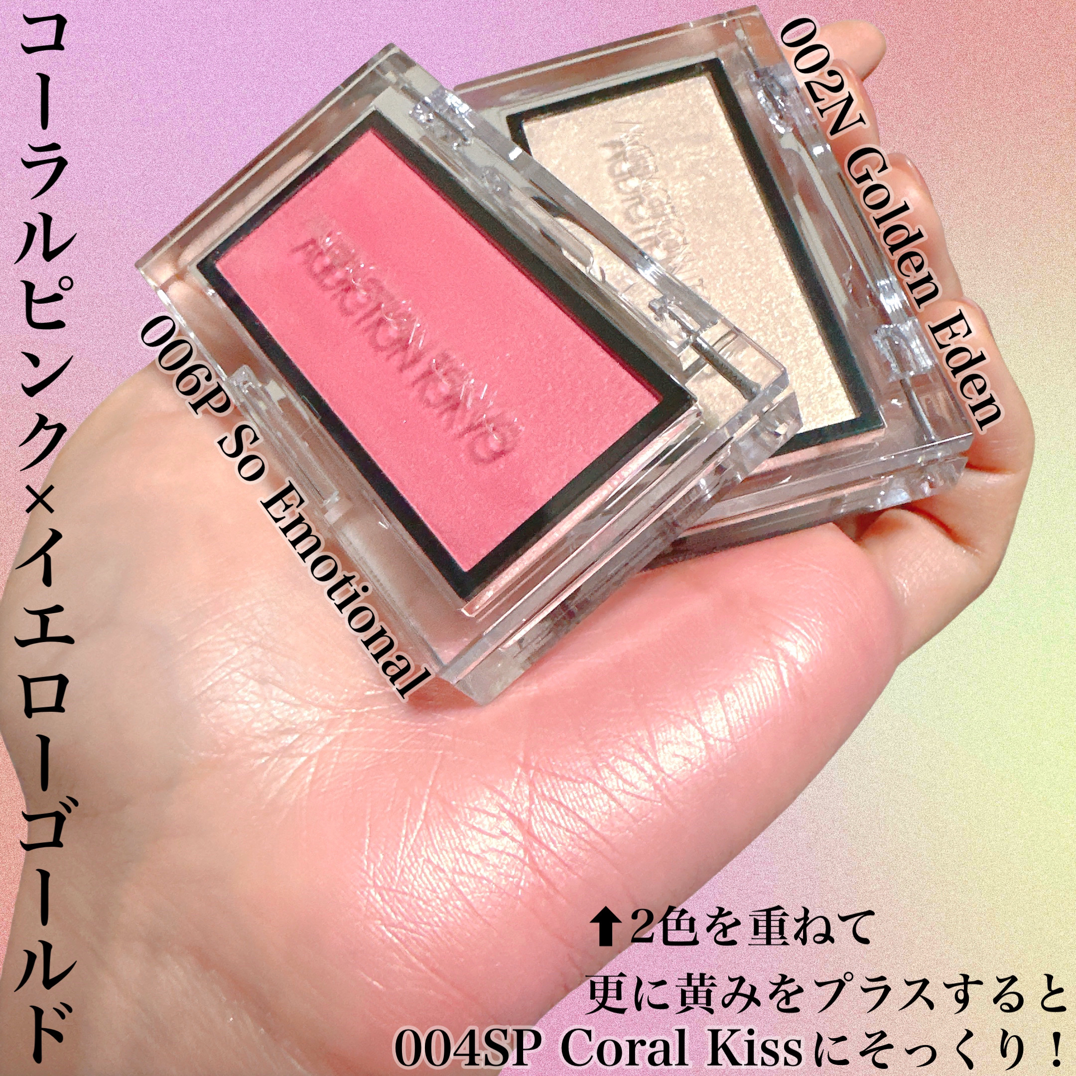 ツヤがあり、なめらかな頬にしてくれるチーク💓 004P Coral Kissは、夕陽を受けて輝く空のように、繊細な煌めきが美しい、上品につやめくパールタイプ💎 クリアで自然な発色で透明感のある仕上がりに🤍 ゴールドが煌めくコーラルピンクの多幸感カラーで、イエベメイクをする時や、春夏によく使いたくなります🫶 粉をオイルでコーティングしているのでパサつきがなくしっとりとした質感で、肌に溶け込み密着してくれます😉