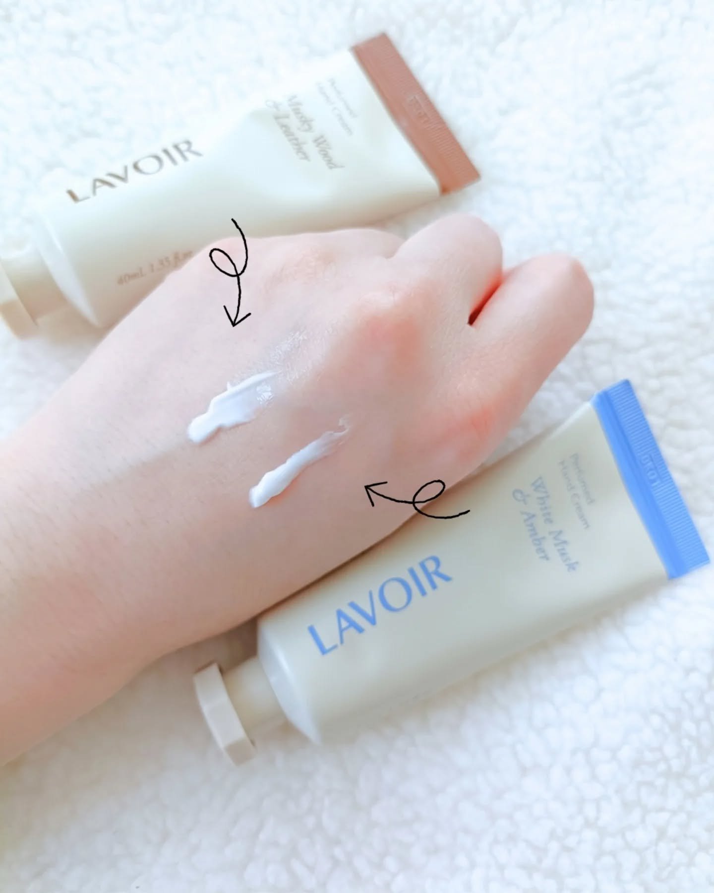 LAVOIRパフュームハンドクリーム#ホワイトムスク&アンバー誰にでも好かれる清潔感のあるやさしい香り#ムスキーウッド&レザーオシャレで大人っぽいスモーキーなウッドの香り男女関係なく使えるシンプルなハンドクリーム。やわらかいテクスチャー...