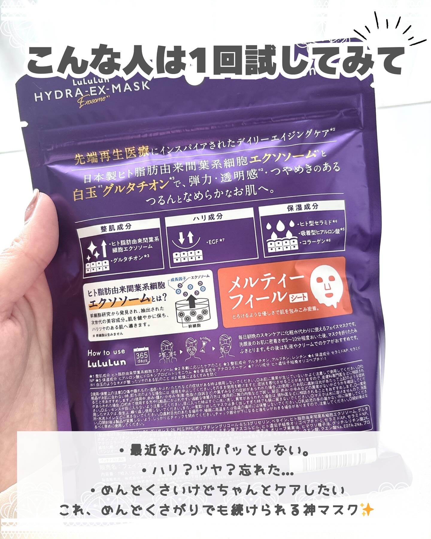 ルルルンハイドラEXマスク✨ルルルンのモニター企画に参加しています🌟毎日の化粧水の代わりに使える化粧水フェイスマスク💡先端再生医療に着想を得たデイリーエイジングケア*¹マスク、ハイドラシリーズの第3弾👏日本製ヒト脂肪由来間葉系細胞エクソソーム...
