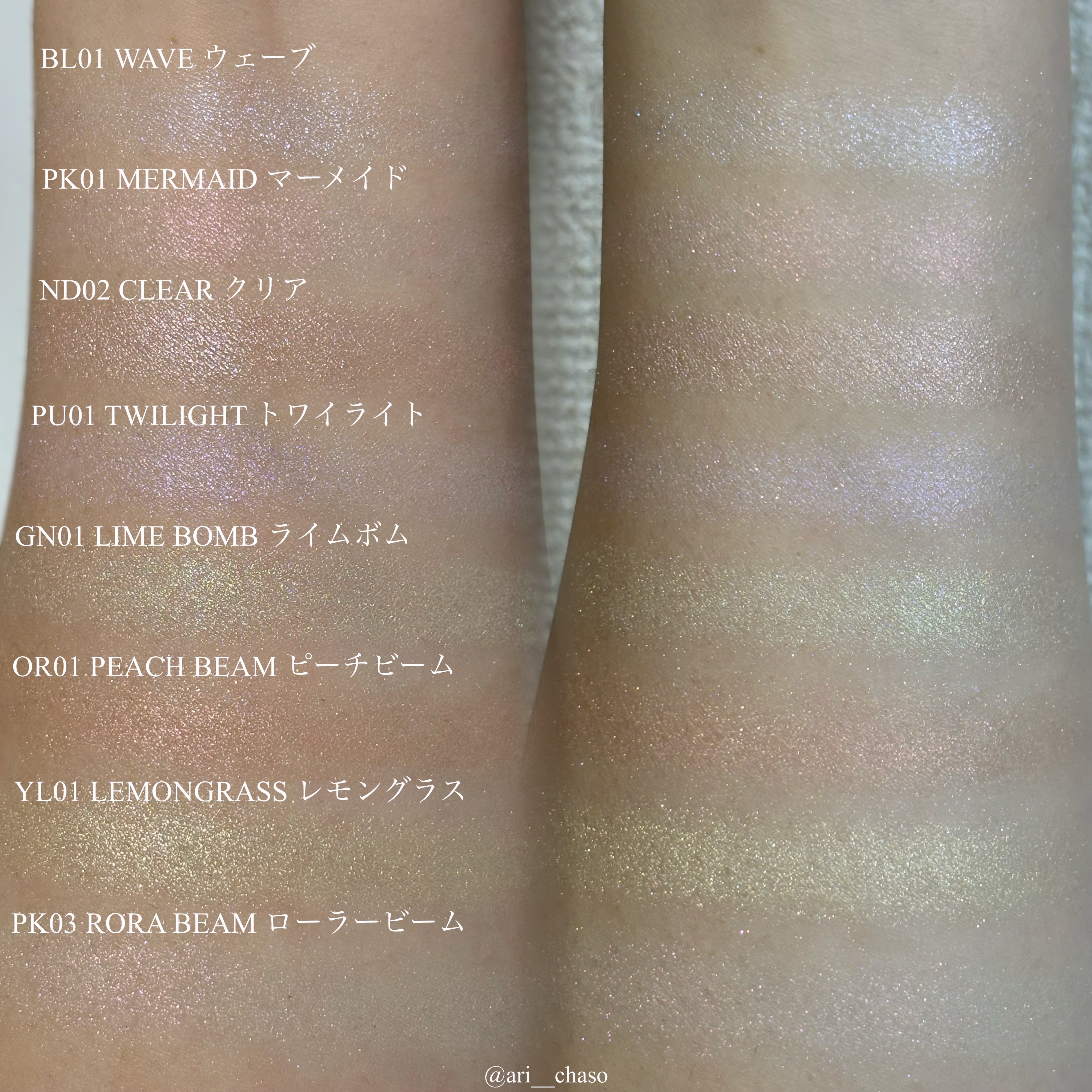 - <BL01ウェーブ> ジメチコン、酸化チタン、マイカ、合成フルオロフロゴパイト、メタクリル酸メチルクロスポリマー、ホウケイ酸(Ca/チタン)、(ビニルジメチコン/メチコンシルセスキオキサン)クロスポリマー、ジエチルヘキサン酸ネオペンチルグリコール、ラウロイルリシン、(ジメチコン/ビニルジメチコン)クロスポリマー、ミリスチン酸Mg、ナイロン-12、(セバシン酸/イソパルミチン酸)ジグリセリル、セスキイソステアリン酸ソルビタン、ヘキサ(ヒドロキシステアリン酸/ステアリン酸/ロジン酸)ジペンタエリスリチル、合成ワックス、フェノキシエタノール、プロパンジオール、グンジョウ、トリエトキシカプリリルシラン、酸化スズ、酸化鉄、トコフェロール <GN01 ライムボム> ジメチコン、酸化チタン、マイカ、合成フルオロフロゴパイト、メタクリル酸メチルクロスポリマー、(ジフェニルジメチコン/ビニルジフェニルジメチコン/シルセスキオキサン)クロスポリマー、ジエチルヘキサン酸ネオペンチルグリコール、ラウロイルリシン、(ジメチコン/ビニルジメチコン)クロスポリマー、ミリスチン酸Mg、ナイロン-12、(ビニルジメチコン/メチコンシルセスキオキサン)クロスポリマー、(セバシン酸/イソパルミチン酸)ジグリセリル、シリカ、ホウケイ酸(Ca/チタン)、セスキイソステアリン酸ソルビタン、ヘキサ(ヒドロキシステアリン酸/ステアリン酸/ロジン酸)ジペンタエリスリチル、メチルプロパンジオール、合成ワックス、プロパンジオール、酸化鉄、酸化クロム、トリエトキシカプリリルシラン、酸化スズ、コンジョウ、トコフェロール <ND01 シェル> ジメチコン、合成フルオロフロゴパイト、酸化チタン、メタクリル酸メチルクロスポリマー、(ビニルジメチコン/メチコンシルセスキオキサン)クロスポリマー、ジエチルヘキサン酸ネオペンチルグリコール、ラウロイルリシン、(ジメチコン/ビニルジメチコン)クロスポリマー、ミリスチン酸Mg、ナイロン-12、(セバシン酸/イソパルミチン酸)ジグリセリル、セスキイソステアリン酸ソルビタン、ヘキサ(ヒドロキシステアリン酸/ステアリン酸/ロジン酸)ジペンタエリスリチル、合成ワックス、フェノキシエタノール、プロパンジオール、トリエトキシカプリリルシラン、酸化鉄、酸化スズ、トコフェロール <ND02 クリア> ジメチコン、合成フルオロフロゴパイト、酸化チタン、メタクリル酸メチルクロスポリマー、マイカ、(ビニルジメチコン/メチコンシルセスキオキサン)クロスポリマー、ジエチルヘキサン酸ネオペンチルグリコール、ラウロイルリシン、(ジメチコン/ビニルジメチコン)クロスポリマー、ミリスチン酸Mg、ナイロン-12、(セバシン酸/イソパルミチン酸)ジグリセリル、セスキイソステアリン酸ソルビタン、ヘキサ(ヒドロキシステアリン酸/ステアリン酸/ロジン酸)ジペンタエリスリチル、合成ワックス、フェノキシエタノール、プロパンジオール、トリエトキシカプリリルシラン、酸化鉄、酸化スズ、赤226、グンジョウ、カルミン、トコフェロール <OR01 ピーチビーム> ジメチコン、マイカ、酸化チタン、合成フルオロフロゴパイト、メタクリル酸メチルクロスポリマー、ホウケイ酸(Ca/チタン)、ジエチルヘキサン酸ネオペンチルグリコール、(ビニルジメチコン/メチコンシルセスキオキサン)クロスポリマー、ラウロイルリシン、(ジメチコン/ビニルジメチコン)クロスポリマー、(ジフェニルジメチコン/ビニルジフェニルジメチコン/シルセスキオキサン)クロスポリマー、ミリスチン酸Mg、ナイロン-12、(セバシン酸/イソパルミチン酸)ジグリセリル、セスキイソステアリン酸ソルビタン、ヘキサ(ヒドロキシステアリン酸/ステアリン酸/ロジン酸)ジペンタエリスリチル、メチルプロパンジオール、合成ワックス、プロパンジオール、酸化鉄、酸化スズ、トリエトキシカプリリルシラン、カルミントコフェロール <PK01 マーメイド> ジメチコン、合成フルオロフロゴパイト、酸化チタン、メタクリル酸メチルクロスポリマー、ホウケイ酸(Ca/チタン)、(ビニルジメチコン/メチコンシルセスキオキサン)クロスポリマー、マイカ、ジエチルヘキサン酸ネオペンチルグリコール、ラウロイルリシン、(ジメチコン/ビニルジメチコン)クロスポリマー、ミリスチン酸Mg、ナイロン-12、(セバシン酸/イソパルミチン酸)ジグリセリル、セスキイソステアリン酸ソルビタン、ヘキサ(ヒドロキシステアリン酸/ステアリン酸/ロジン酸)ジペンタエリスリチル、合成ワックス、フェノキシエタノール、プロパンジオール、トリエトキシカプリリルシラン、酸化スズ、グンジョウ、酸化鉄、赤226、トコフェロール <PK02 ピンクベル> ジメチコン、合成フルオロフロゴパイト、酸化チタン、メタクリル酸メチルクロスポリマー、マイカ、ホウケイ酸(Ca/Al)、ジエチルヘキサン酸ネオペンチルグリコール、(ビニルジメチコン/メチコンシルセスキオキサン)クロスポリマー、ホウケイ酸(Ca/チタン)、ラウロイルリシン、(ジメチコン/ビ
