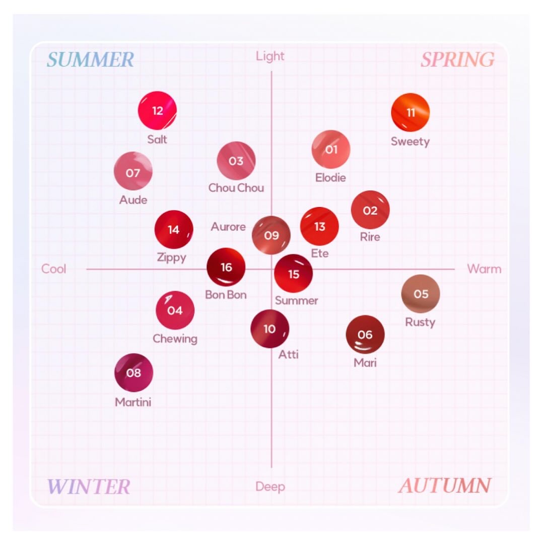 - <01 エロディー> 水、グリセリン、DPG、テトラエチルヘキサン酸ペンタエリスリチル、ダイマージリノール酸水添ヒマシ油、ジイソステアリン酸ポリグリセリル-3、ステアリン酸グリセリル(SE)、ステアリン酸ソルビタン、(アクリロイルジメチルタウリンアンモニウム/VP)コポリマー、水添ポリシクロペンタジエン、リンゴ酸ジイソステアリル、酸化チタン、ステアリン酸PEG-100、テトライソステアリン酸ペンタエリスリチル、(アクリル酸Na/アクリロイルジメチルタウリンNa)コポリマー、ラウリン酸ヘキシル、クロルフェネシン、カプリリルグリコール、エチルヘキシルグリセリン、イソヘキサデカン、香料、ヤシ脂肪酸スクロース、BG、ジヒドロキシアセトン、ジメチコン、キイチゴエキス、黄5、ポリソルベート80、赤102、トロポロン、1,2-ヘキサンジオール、赤227、ヒアルロン酸Na、EDTA-2Na、黄4、カニナバラ果実油、アンズ核油、青1 <02 リル> 水、グリセリン、DPG、テトラエチルヘキサン酸ペンタエリスリチル、ダイマージリノール酸水添ヒマシ油、ジイソステアリン酸ポリグリセリル-3、ステアリン酸グリセリル(SE)、ステアリン酸ソルビタン、(アクリロイルジメチルタウリンアンモニウム/VP)コポリマー、(VP/ヘキサデセン)コポリマー、ジヒドロキシアセトン、スクワラン、水添ポリシクロペンタジエン、ステアリン酸PEG-100、(アクリル酸Na/アクリロイルジメチルタウリンNa)コポリマー、フェノキシエタノール、クロルフェネシン、イソヘキサデカン、リンゴ酸ジイソステアリル、酸化チタン、香料、ヤシ脂肪酸スクロース、赤102、BG、ジメチコン、ポリソルベート80、カプリリルグリコール、エチルヘキシルグリセリン、1,2-ヘキサンジオール、橙205、ヒアルロン酸Na、EDTA-2Na、赤227、トロポロン、カニナバラ果実油、アンズ核油、青1、キイチゴエキス <03 シュシュ> 水、グリセリン、DPG、テトラエチルヘキサン酸ペンタエリスリチル、ダイマージリノール酸水添ヒマシ油、ジイソステアリン酸ポリグリセリル-3、ステアリン酸グリセリル(SE)、ステアリン酸ソルビタン、(アクリロイルジメチルタウリンアンモニウム/VP)コポリマー、水添ポリシクロペンタジエン、リンゴ酸ジイソステアリル、酸化チタン、ステアリン酸PEG-100、テトライソステアリン酸ペンタエリスリチル、(アクリル酸Na/アクリロイルジメチルタウリンNa)コポリマー、ラウリン酸ヘキシル、クロルフェネシン、カプリリルグリコール、エチルヘキシルグリセリン、イソヘキサデカン、香料、ヤシ脂肪酸スクロース、BG、ジヒドロキシアセトン、ジメチコン、キイチゴエキス、ポリソルベート80、赤102、赤227、トロポロン、1,2-ヘキサンジオール、黄4、ヒアルロン酸Na、EDTA-2Na、カニナバラ果実油、アンズ核油、青1 <04 チューイン> 水、グリセリン、DPG、テトラエチルヘキサン酸ペンタエリスリチル、ダイマージリノール酸水添ヒマシ油、ジイソステアリン酸ポリグリセリル-3、ステアリン酸グリセリル(SE)、リンゴ酸ジイソステアリル、酸化チタン、ステアリン酸ソルビタン、水添ポリシクロペンタジエン、(アクリロイルジメチルタウリンアンモニウム/VP)コポリマー、ステアリン酸PEG-100、テトライソステアリン酸ペンタエリスリチル、ラウリン酸ヘキシル、黄5、赤104(1)、クロルフェネシン、カプリリルグリコール、エチルヘキシルグリセリン、香料、赤227、ヤシ脂肪酸スクロース、(アクリル酸Na/アクリロイルジメチルタウリンNa)コポリマー、BG、ジヒドロキシアセトン、ジメチコン、キイチゴエキス、イソヘキサデカン、トロポロン、1,2-ヘキサンジオール、ポリソルベート80、ヒアルロン酸Na、EDTA-2Na、カニナバラ果実油、アンズ核油 <05 ラスティー> 水、グリセリン、リンゴ酸ジイソステアリル、DPG、テトラエチルヘキサン酸ペンタエリスリチル、酸化チタン、水添ヒマシ油、ジステアリン酸ポリグリセリル-3メチルグルコース、ステアリン酸グリセリル(SE)、ステアリン酸ソルビタン、(VP/ヘキサデセン)コポリマー、酸化鉄、(アクリロイルジメチルタウリンアンモニウム/VP)コポリマー、ジヒドロキシアセトン、スクワラン、水添ポリシクロペンタジエン、ステアリン酸PEG-100、(アクリル酸Na/アクリロイルジメチルタウリンNa)コポリマー、赤102、クロルフェネシン、イソヘキサデカン、香料、カプリリルグリコール、エチルヘキシルグリセリン、ヤシ脂肪酸スクロース、BG、ジメチコン、黄4、ポリソルベート80、グンジョウ、1,2-ヘキサンジオール、トロポロン、ヒアルロン酸Na、EDTA-2Na、カニナバラ果実油、アンズ核油、キイチゴエキス <06 マリー> 水、グリセリン、DPG、テトラエチルヘキサン酸ペンタエリスリチル、ダイマージリノール酸水添ヒマシ油、ジイソステアリン酸ポリグリセリル-3、ステアリン酸グリセリル(SE)、ステアリン酸ソルビタン、水添ポリシクロペンタジエン、リンゴ酸ジイソステアリル、(アクリロイルジメチルタウリンアンモニウム/VP)コポリマー、酸化チタン、ステアリ