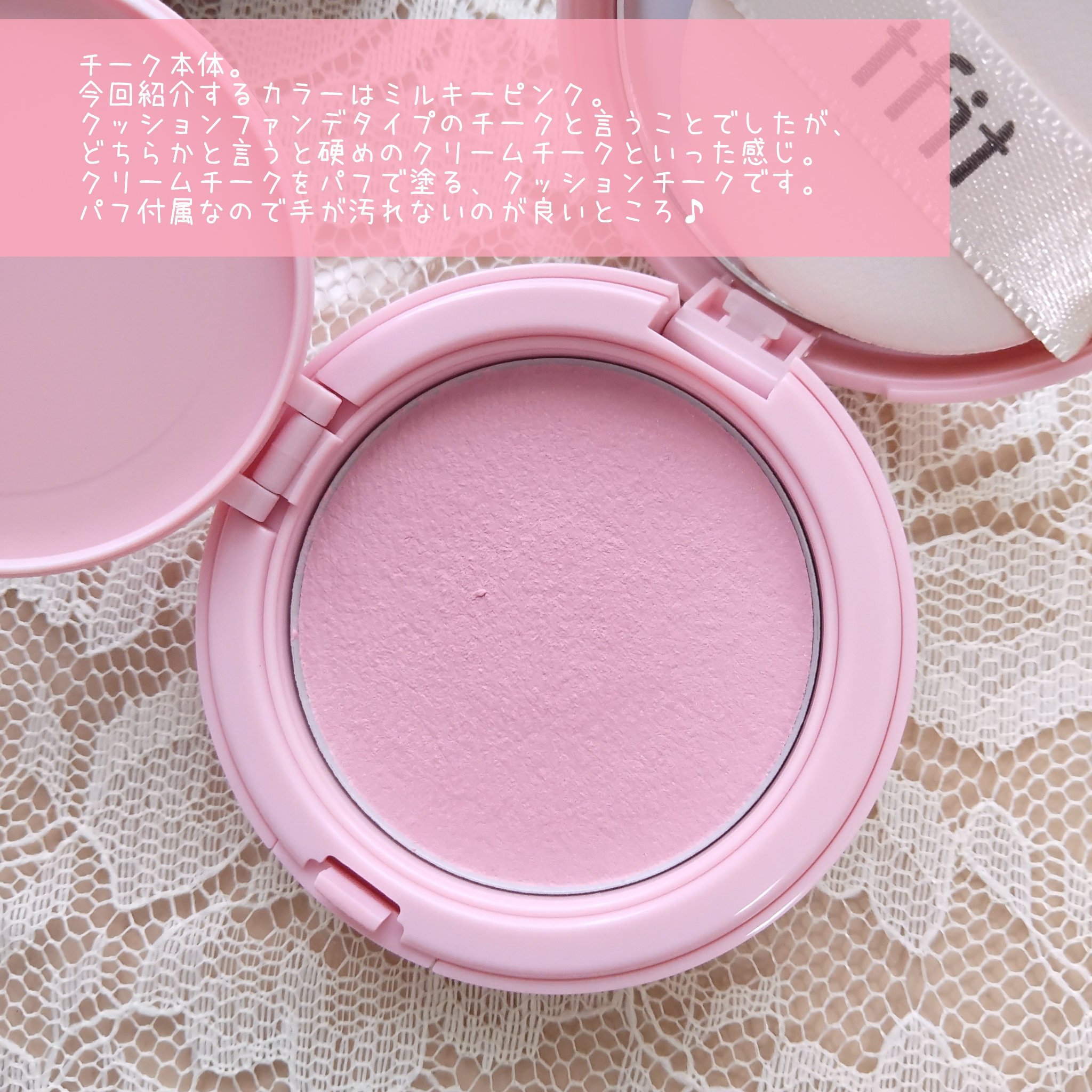 tfitフラッフィーベルベットクッションチーク#P02ブルームピンク大好きなtfit様のモニターでいただきました🩷素敵な機会をありがとうございます🌸手のひらに収まるころんとしたパッケージが可愛いチーク。クッションファンデみたいにパフがついてて...