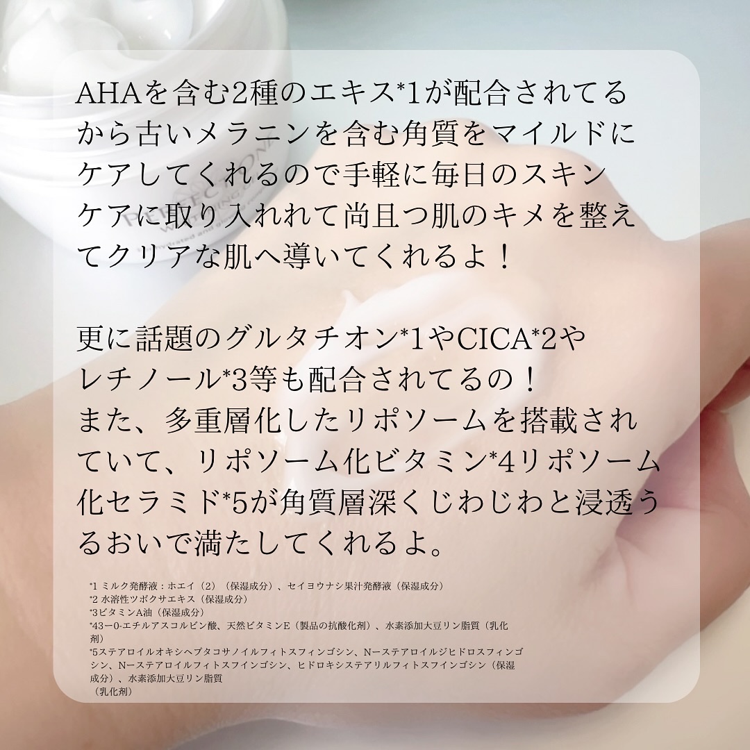 - <パーフェクトワン 薬用ホワイトニングジェル> アルブチン、L ーアスコルビン酸 2 ーグルコシド、グリチルリチン酸ジカリウム、水溶性コラーゲン液、水溶性コラーゲン液(3)、加水分解 コラーゲン液(4)、サクシニルアテロコラーゲン液、コラーゲン・トリペプチド F、イソステアロイル加水分解コラーゲン液(2)、シクロヘキサン ジカルボン酸ビスエトキシジグリコール、イザヨイバラエキス、ビルベリー葉エキス、アルピニアカツマダイ種子エキス、チンピエキス、タイムエキ ス(1)、セイヨウオオバコ種子エキス、ウメ果実エキス、豆乳発酵液、シャクヤクエキス、異性化糖、ヒアルロン酸ナトリウム(2)、加水分解ヒアル ロン酸、ステアロイルオキシヘプタコサノイルフィトスフィンゴシン、N ーステアロイルジヒドロスフィンゴシン、N ーステアロイルフィトスフィンゴ シン、ヒドロキシステアリルフィトスフィンゴシン、フィトステロール、油溶性シコンエキス(1)、ゲットウ葉エキス、ヒメフウロエキス、ヨクイニンエ キス、シーグラスエキス、サンゴ草抽出液、アーティチョークエキス、ニーム葉エキス、オウゴンエキス、センブリエキス、酵母エキス (4)、ニンジン エキス、アロエエキス(2)、サクラ葉抽出液、ユキノシタエキス、プラセンタエキス (1)、セイヨウナシ果汁発酵液、パウダルコ樹皮エキス、カンゾ ウ抽出末、カンゾウフラボノイド、植物性スクワラン、コンドロイチン硫酸ナトリウム、εーポリリジン 10% 溶液、ポリグルタミン酸塩、濃グリセリ ン、1,3 ーブチレングリコール、1,2 ーペンタンジオール、グリセリン、リン酸 L ーアスコルビルマグネシウム、トレハロース、L ーオキシプロリン、ホエイ(2)、トリ2 ーエチルヘキサン酸グリセリル、アルギン酸ナトリウム、サラシミツロウ、無水ケイ酸、ベヘニルアルコール、シリル化処理無水 ケイ酸、水素添加大豆リン脂質、モノミリスチン酸デカグリセリル、親油型モノステアリン酸グリセリル、カルボキシビニルポリマー、水酸化ナトリ ウム、2 ーエチルヘキサン酸セチル、メチルポリシロキサン、天然ビタミン E、パルミチン酸セチル、低強度カンテン末、キサンタンガム、N ーアセ チルー L ーシステイン、クエン酸、ピロ亜硫酸ナトリウム、スクワラン、ジエチレントリアミン五酢酸五ナトリウム液、無水エタノール、エタノール、フェノキシエタノール、香料