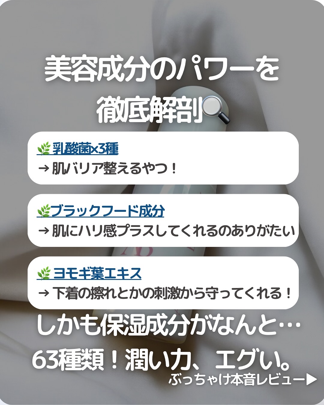 - 肌荒れとうるおいをサポートする植物由来複合成分¹*がパワーアップ*²。 3種の乳酸菌成分*³がデリケートエリアの肌バリアをサポートします。 デリケートエリアのpHにこだわった弱酸性ソープで自信溢れる心地よい毎日を。 敏感肌パッチテスト済み* *すべての方に皮膚刺激が起こらないということではありません POINT01:デリケートエリアのニオイと、くすみの原因となる角質*¹を同時にケア 3種の乳酸菌成分*²がデリケートエリアの肌バリアをサポートし、弱酸性の洗浄力で不快感(乾燥やニオイ)を防ぎます。 角質による黒ずみ*¹にアプローチするクエン酸を配合し、敏感な部分にも使えるマイルドな泡で優しく洗い上げます。 フェイスと同じようにデリケートエリアも専用ソープでケアすることで、女性が直面するさまざまな悩みをサポートします。 ¹*古い角質によるもの ²*乳酸桿菌発酵液、バチルス発酵物、乳酸桿菌培養溶解質(すべて保湿成分) POINT02:2大保湿成分*¹*²の掛け合わせで洗うたび潤う。 ダイズ種子エキスやゴマ種子エキスなどを配合したブラックフード成分*¹が、デリケートエリアの肌をふっくらとハリのあるいきいきとした印象へ。 ゴーヤ成分と発酵成分を融合させた独自の成分*²が、水分保持をサポートし乾燥から肌を守り潤いで満たします。 また保湿成分は従来品の19種から63種*³に増加しました。 *¹コメエキス、ダイズ種子エキス、ゴマ種子エキス、ローブッシュブルーベリー果実エキス、アズキ種子エキス、ナス果実エキス、ゴボウ根エキス、マコンブエキス、ワカメエキス(すべて保湿成分)*²ツルレイシ果実エキス、乳酸桿菌発酵液(すべて保湿成分)*³グリセリン、DPG、カワラヨモギエキス、セイヨウキズタエキス、乳酸桿菌発酵液、アロエベラ葉エキス、バチルス発酵物、乳酸桿菌培養溶解質、レモングラスエキス、セージ葉エキス、キャベツ葉エキス、メマツヨイグサ花エキス、コメエキス、ダイオウショウ葉エキス、プルヌスセロチナ果実エキス、クズ根エキス、ウルムスダビディアナ根エキス、カミツレ花エキス、ラベンダー花エキス、ローズマリーエキス、タイマツバナ葉エキス、ローズマリー葉エキス、ダイズ種子エキス、マグワ果実エキス、ヨーロッパキイチゴ果実エキス、ゴマ種子エキス、ヨモギ葉エキス、ニュウコウジュ樹脂エキス、トウキンセンカ花エキス、アサイヤシ果実エキス、ホクベイフウロソウエキス、メリッサ葉エキス、ツルレイシ果実エキス、ローブッシュブルーベリー果実エキス、ブドウ果実エキス、ヒナギク花エキス、カミツレエキス、ライム果実エキス、オレンジ果実エキス、レモン果実エキス、ハマメリス葉エキス、ソケイエキス、ラベンダーエキス、スイカズラ花エキス、コブシ枝/花/葉エキス、マンゴー果実エキス、メリッサエキス、ミドリハッカエキス、バナナ果実エキス、ハス花エキス、シャクヤク花エキス、アズキ種子エキス、リンゴ果実エキス、セイヨウニワトコ花エキス、ナス果実エキス、ビート根エキス、サツマイモ根エキス、タマネギ根エキス、ゴボウ根エキス、マコンブエキス、ザクロ果実エキス、ワカメエキス、ワインエキス POINT03:繊細なデリケートエリアの揺らぎと美肌、キメまでも追求。 従来品の17種から56種にパワーアップした植物由来複合成分*が、一般的には洗浄液ではケアしずらい毛穴の汚れや皮脂へアプローチし、キメを整えながら健やかな肌に保ちます。 植物由来複合成分*の1つであるヨモギ葉エキスが衣類から影響する乾燥や摩擦といった外的刺激から肌を守り、デリケートエリアへしっかりアプローチします。 *カワラヨモギエキス、セイヨウキズタエキス、アロエベラ葉エキス、レモングラスエキス、セージ葉エキス、キャベツ葉エキス、メマツヨイグサ花エキス、コメエキス、ダイオウショウ葉エキス、プルヌスセロチナ果実エキス、クズ根エキス、ウルムスダビディアナ根エキス、カミツレ花エキス、ラベンダー花エキス、ローズマリーエキス、タイマツバナ葉エキス、ローズマリー葉エキス、ダイズ種子エキス、マグワ果実エキス、ヨーロッパキイチゴ果実エキス、ゴマ種子エキス、ヨモギ葉エキス、ニュウコウジュ樹脂エキス、トウキンセンカ花エキス、アサイヤシ果実エキス、ホクベイフウロソウエキス、メリッサ葉エキス、ツルレイシ果実エキス、ローブッシュブルーベリー果実エキス、ブドウ果実エキス、ヒナギク花エキス、カミツレエキス、ライム果実エキス、オレンジ果実エキス、レモン果実エキス、ハマメリス葉エキス、ソケイエキス、ラベンダーエキス、スイカズラ花エキス、コブシ枝/花/葉エキス、マンゴー果実エキス、メリッサエキス、ミドリハッカエキス、バナナ果実エキス、ハス花エキス、シャクヤク花エキス、アズキ種子エキス、リンゴ果実エキス、セイヨウニワトコ花エキス、ナス果実エキス、ビート根エキス、サツマイモ根エキス、タマネギ根エキス、ゴボウ根エキス、ザクロ果