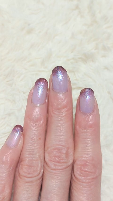やっぱり、この #rom&ndムードペブルネイル 08 PURPLE MOOD は、たまらなく好きなカラーだぁ✨✨✨ #キャンメイク #カラフルネイルズ N52 マーメイドスケール を、のせて その上から、PURPLE MOODを薄く重ねたら めっちゃキレイな光り方をしたぁぁぁ✨✨✨ 自画自賛❤