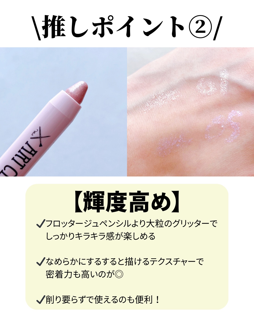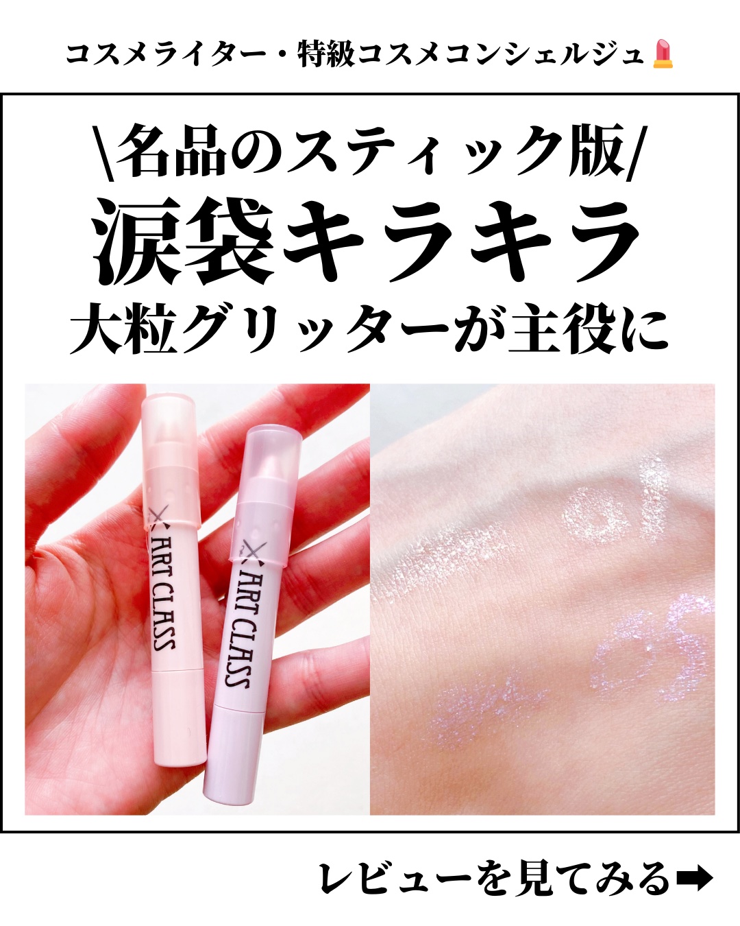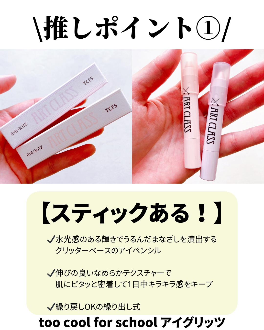 toocoolforschool様より提供いただきました。涙袋メイクやアイシャドウに大活躍のアイグリッツ2色くり出すペンシルタイプが使いやすいです。なめらかにするするっとラメを乗せられるのがいいですね。指でなじませたら、落ちないラメの出来上が...