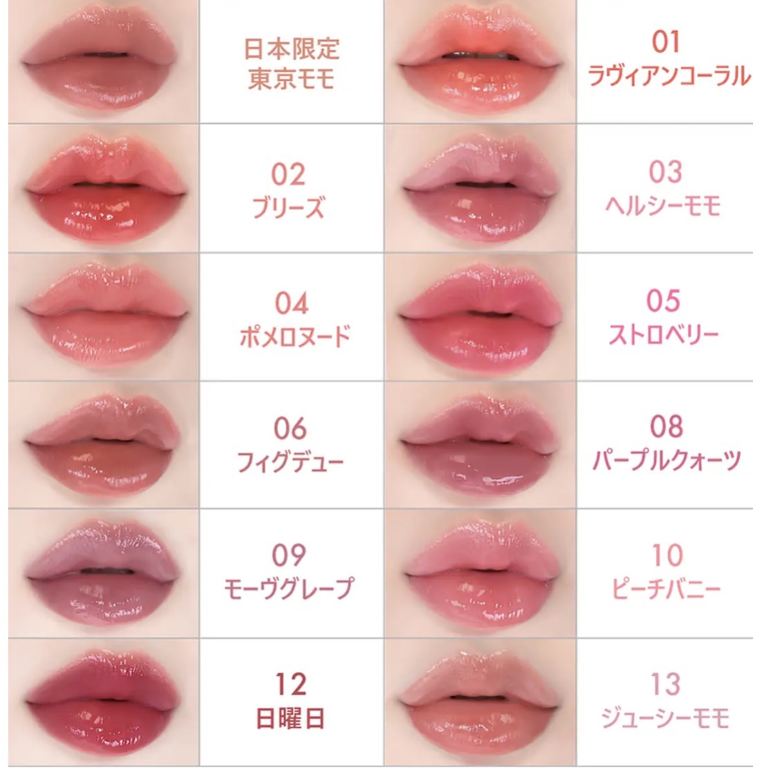 - <01 ラヴィアンコーラル> 精製水、ジフェニルジメチコン、リンゴ酸ジイソステアリル、ビスジグリセリルポリアシルアジペート-2、水添ポリイソブテン、ジグリセリン、セチルPEG/PPG-10/1ダイメチコン、DPG、イソステアリン酸ソルビタン、ポリソルベート60、オクチルドデカノール、ペンチレングリコール、グリセリン、二酸化チタン、セテアレス-20、アクリル酸ヒドロキシエチル/ナトリウムアクリロイルジメチルタウリン酸共重合体フェノキシエタノール、スクアラン、ポリグリセリン-3、香料、ステビオシド、黄色4号、エチルヘキシルグリセリン、赤色227号、トリ(カプリル/カプリン酸)グリセリル、赤色104号(1)、トコフェリルアセテート、黄色5 号、ブリリアントブルーFCF、マンゴー果実エキス、リンゴエキス <06 フィグデュー> 水、ジフェニルジメチコン、リンゴ酸ジイソステアリル、ポリアシルアジピン酸ビス-ジグリセリル-2、水添ポリイソブテン、ジグリセリン、セチルPEG/PPG-10/1ジメチコン、ジプロピレングリコール、イソステアリン酸ソルビタン、ポリソルベート60、オクチルドデカノール、ペンチレングリコール、グリセリン、二酸化チタン(CI) 77891)、セテアレス-20、アクリル酸ヒドロキシエチル/アクリロイルジメチルタウリンナトリウムコポリマー、スクワラン、フェノキシエタノール、ポリグリセリン-3、香料、ステビオシド、赤28(CI 45410)、黄6(CI 15985)、黄5(CI 19140)、エチルヘキシルグリセリン、レッド 33 (CI 17200)、カプリル酸/カプリン酸トリグリセリド、酢酸トコフェロール、ブルー 1 (CI 42090)、Mangifera Indica (マンゴー) 果実エキス、Pyrus Malus (リンゴ) 果実エキス <12 日曜日> 水、ジフェニルジメチコン、リンゴ酸ジイソステアリル、ビスジグリセリルポリアシルアジペート-2、水添ポリイソブテン、ジグリセリン、セチルPEG/PPG-10/1ジメチコン、DPG、イソステアリン酸ソルビタン、ポリソルベート60、オクチルドデカノール、ペンチレングリコール、グリセリン、セテアレス-20、(アクリル酸ヒドロキシエチル/アクリロイルジメチルタウリンNa)コポリマー、フェノキシエタノール、スクワラン、ポリグリセリン-3、ステビオシド、香料、エチルヘキシルグリセリン、トリ(カプリル酸/カプリン酸)グリセリル、酢酸トコフェロール、マンゴー果実エキス、リンゴ果実エキス、酸化チタン、酸化鉄、黄4、赤227、赤104(1)、黄5、青1 <【旧】02 漢江ブリーズ> 水、ジフェニルジメチコン、リンゴ酸ジイソステアリル、ポリアシルアジピン酸ビス-ジグリセリル-2、水添ポリイソブテン、ジグリセリン、セチルPEG/PPG-10/1ジメチコン、ジプロピレングリコール、イソステアリン酸ソルビタン、ポリソルベート60、オクチルドデカノール、ペンチレングリコール、グリセリン、二酸化チタン(CI) 77891)、セテアレス-20、アクリル酸ヒドロキシエチル/アクリロイルジメチルタウリンナトリウムコポリマー、フェノキシエタノール、スクワラン、イエロー6 (CI 15985)、ポリグリセリン-3、香料、ステビオシド、エチルヘキシルグリセリン、レッド33 (CI 17200)、レッド28 (CI 45410)、トリカプリル/カプリン酸グリセリド、酢酸トコフェロール、ブルー 1 (CI 42090)、Mangifera Indica (マンゴー) 果実エキス、Pyrus Malus (リンゴ) 果実エキス <【旧】05 ヒップジロー> 水、ジフェニルジメチコン、リンゴ酸ジイソステアリル、ポリアシルアジピン酸ビス-ジグリセリル-2、水添ポリイソブテン、ジグリセリン、セチルPEG/PPG-10/1ジメチコン、ジプロピレングリコール、イソステアリン酸ソルビタン、ポリソルベート60、オクチルドデカノール、ペンチレングリコール、グリセリン、二酸化チタン(CI) 77891)、セテアレス-20、アクリル酸ヒドロキシエチル/アクリロイルジメチルタウリンナトリウムコポリマー、スクワラン、フェノキシエタノール、イエロー6 (CI 15985)、ポリグリセリン-3、香料、ステビオシド、エチルヘキシルグリセリン、レッド33 (CI 17200)、カプリル酸/カプリン酸トリグリセリド、酢酸トコフェロール、ブルー 1 (CI 42090)、Mangifera Indica (マンゴー) 果実エキス、Pyrus Malus (リンゴ) 果実エキス <【旧】09 ソウル ソウル> 水、ジフェニルジメチコン、マレートジソステアル、ビスジグリセリルポリシルダイピン-2、水素化ポリイソブテン、ディグリセリン、セチルペグ/PPG-10/1ジメチコン、ジップロピレングリコール、ソルビトン等酸塩、ポリソルベ酸60、オクティロドデドカン、ペンシェルン、ペントリン酸塩、ペントリ酸塩、ペンシュレン 二酸化チタン (CI 77891)、アクリル酸ヒドロキシエチル/アクリロイルジメチルタウリン酸ナトリウムコポリマー、フェノキシエタノール、スクワラン、イエロー6 (CI 15985)、ポリグリセリン-3、香料、ステビオシド、エチルヘキシルグリセリン、レッド33 (CI 17200)、カプリル酸/カプリン酸トリグリセリド、酢酸トコフェロール、ブルー 1 (CI 42090)、Mangifera Indica (マンゴー) 果実エキス、Pyrus Malus (リンゴ) 果実エキス <【旧】10 朝イチジク> 水、ジフェニルジメ