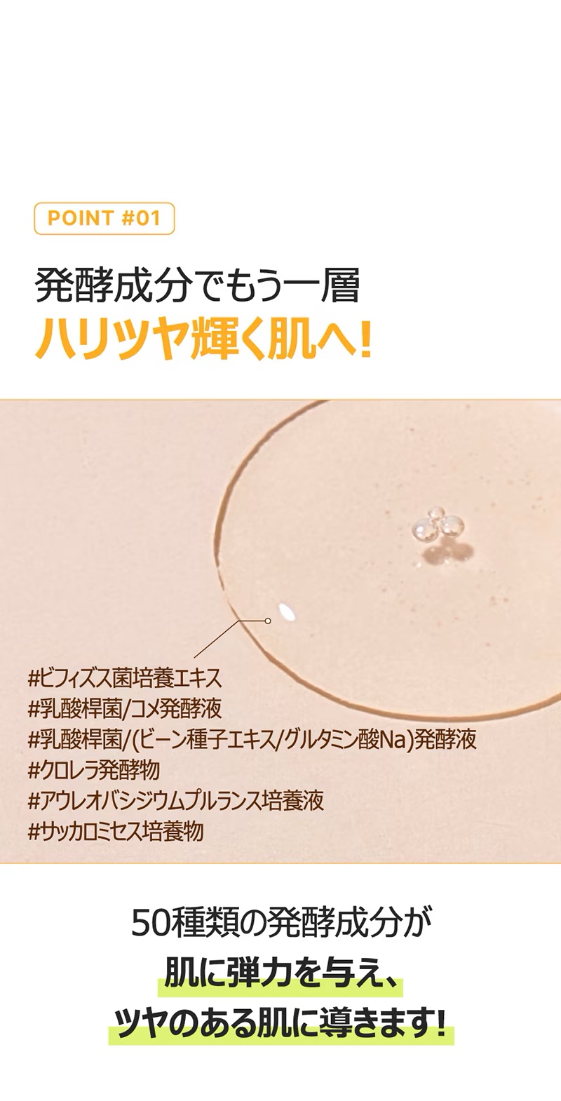 - 50種類の発酵成分(保湿)がキメを整えツルスベ肌へ導くエッセンシャル化粧水。
