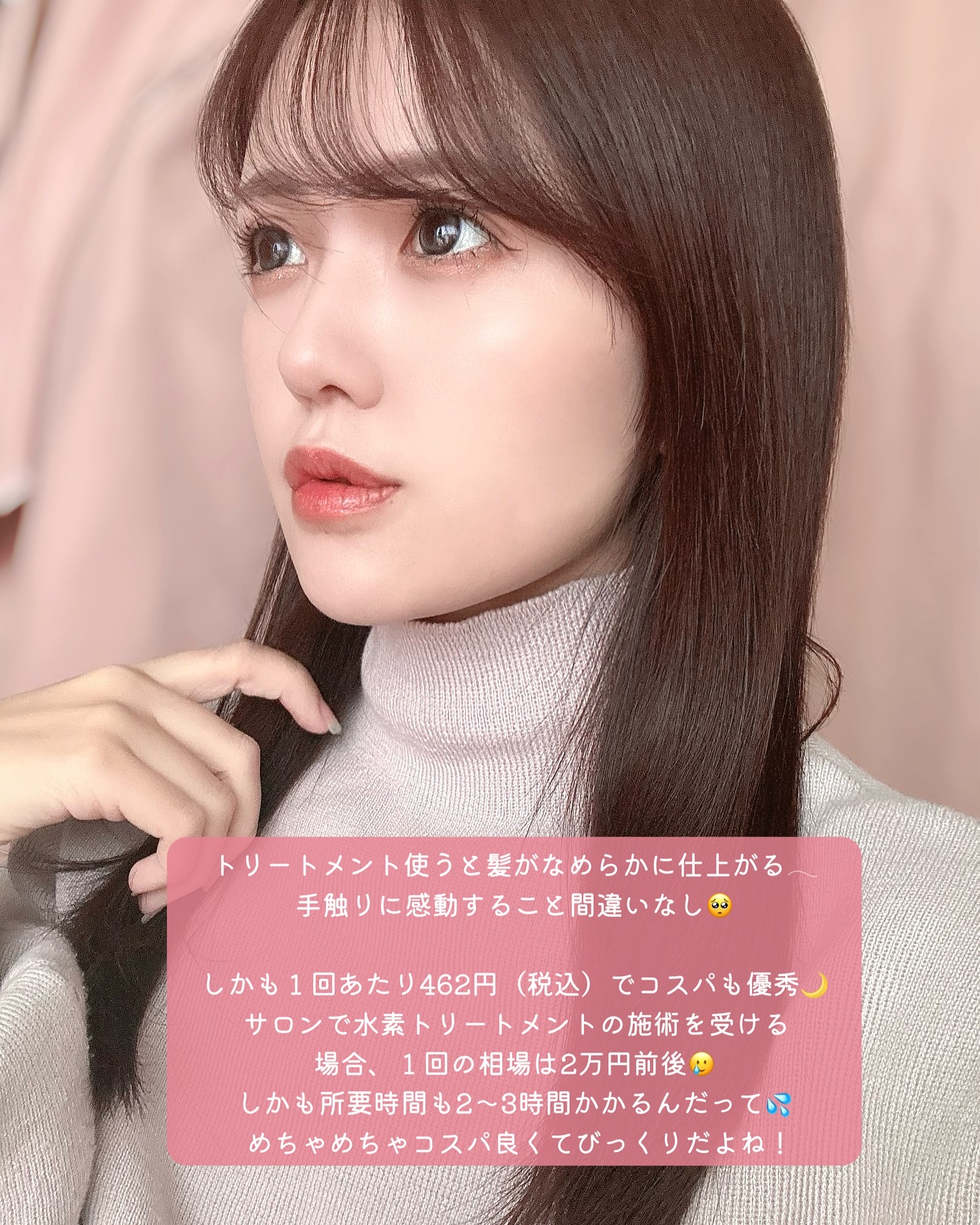 サロンで話題の本格ダメージケアの水素*トリートメント!なんと1回462円でコスパ良く、自宅で本格ダメージケアが可能に✨ 自宅で60秒**お風呂で塗るだけ簡単!トリートメント特有のぬるぬる感がなく、髪へのなじみが良かったです! 塗るだけでとぅるツヤ髪になるのも嬉しい☺️