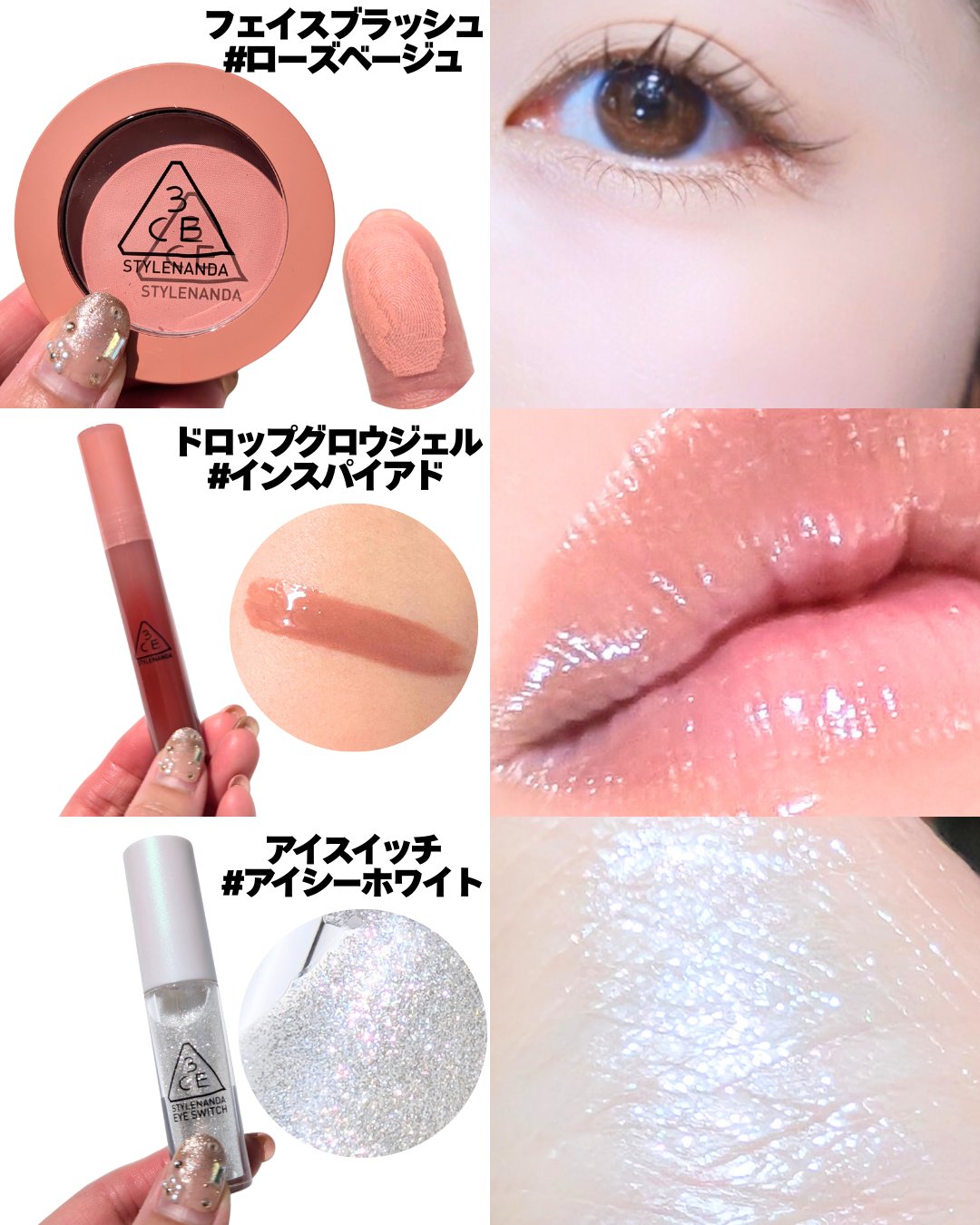 3CEピンククリスタルコレクション大人も使える上品ピンク!カラーもラメ感も強すぎないからラインで使っても甘くなりすぎず綺麗にまとまるよ✔ミューテッドクリスタルピンク…くすみや淡いカラー中心で甘すぎないトレンド感のあるピンクメイクにおすすめの4...