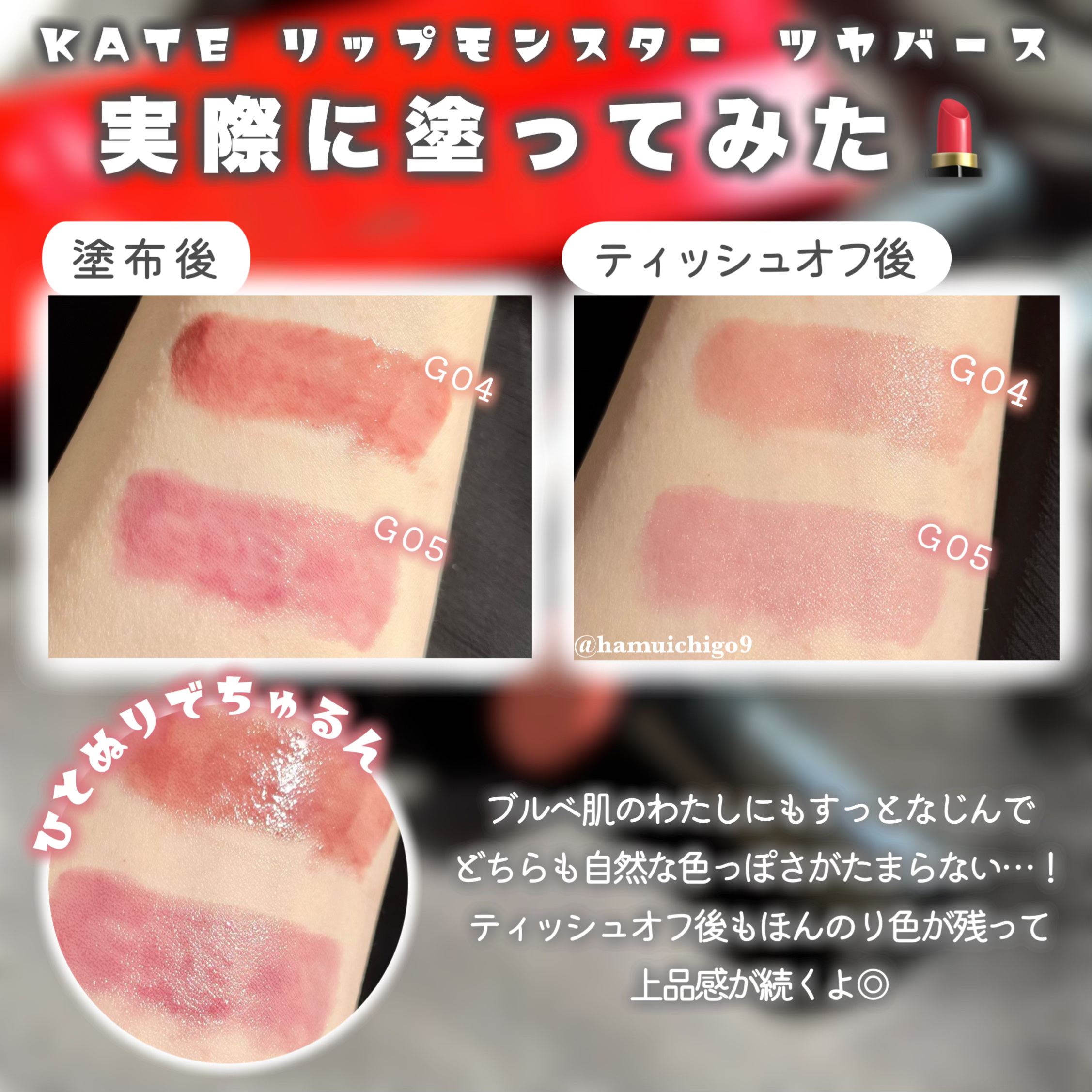 リップモンスターの良さはそのままでツヤツヤ感たっぷりになった「リップモンスターツヤバース」早くも新色が登場するよ🎉!新色は2色。・G04 スパイダーリリー調香師 ベージュレッド系。 意外と誰でも馴染みの良さそうなカラーなので ブルベの私でも使...