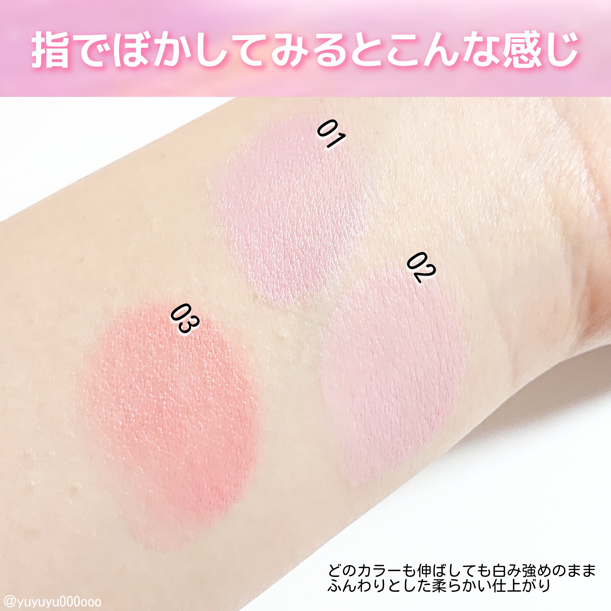 - <01 ヴィーナスラベンダー> 水、イソドデカン、ジメチコン、リンゴ酸ジイソステアリル、(ジメチコン/ビニルジメチコン)クロスポリマー、セチルPEG/PPG-10/1ジメチコン、グリセリン、PG、1,2-ヘキサンジオール、ツボクサエキス、ローズマリー葉エキス、コラーゲンアミノ酸、アボカド油、アマニ油、アルガニアスピノサ核油、オリーブ果実油、ヒマワリ種子油、マカデミア種子油、ヤシ油、ステアリン酸Mg、セチルジメチコン、カプリリルグリコール、酢酸トコフェロール、ソルビン酸K、安息香酸Na、フェノキシエタノール、[+/-]合成フルオロフロゴパイト、酸化チタン、マンガンバイオレット、赤201、赤202、黄4 <02 アイドルピンク> 水、イソドデカン、ジメチコン、リンゴ酸ジイソステアリル、(ジメチコン/ビニルジメチコン)クロスポリマー、セチルPEG/PPG-10/1ジメチコン、グリセリン、PG、1,2-ヘキサンジオール、ツボクサエキス、ローズマリー葉エキス、コラーゲンアミノ酸、アボカド油、アマニ油、アルガニアスピノサ核油、オリーブ果実油、ヒマワリ種子油、マカデミア種子油、ヤシ油、ステアリン酸Mg、セチルジメチコン、カプリリルグリコール、酢酸トコフェロール、ソルビン酸K、安息香酸Na、フェノキシエタノール、[+/-]合成フルオロフロゴパイト、酸化チタン、マンガンバイオレット、赤201、赤202、黄4 <03 チャーミーコーラル> 水、イソドデカン、ジメチコン、リンゴ酸ジイソステアリル、(ジメチコン/ビニルジメチコン)クロスポリマー、セチルPEG/PPG-10/1ジメチコン、グリセリン、PG、1,2-ヘキサンジオール、ツボクサエキス、ローズマリー葉エキス、コラーゲンアミノ酸、アボカド油、アマニ油、アルガニアスピノサ核油、オリーブ果実油、ヒマワリ種子油、マカデミア種子油、ヤシ油、ステアリン酸Mg、セチルジメチコン、カプリリルグリコール、酢酸トコフェロール、ソルビン酸K、安息香酸Na、フェノキシエタノール、[+/-]合成フルオロフロゴパイト、酸化チタン、マンガンバイオレット、赤201、赤202、黄4
