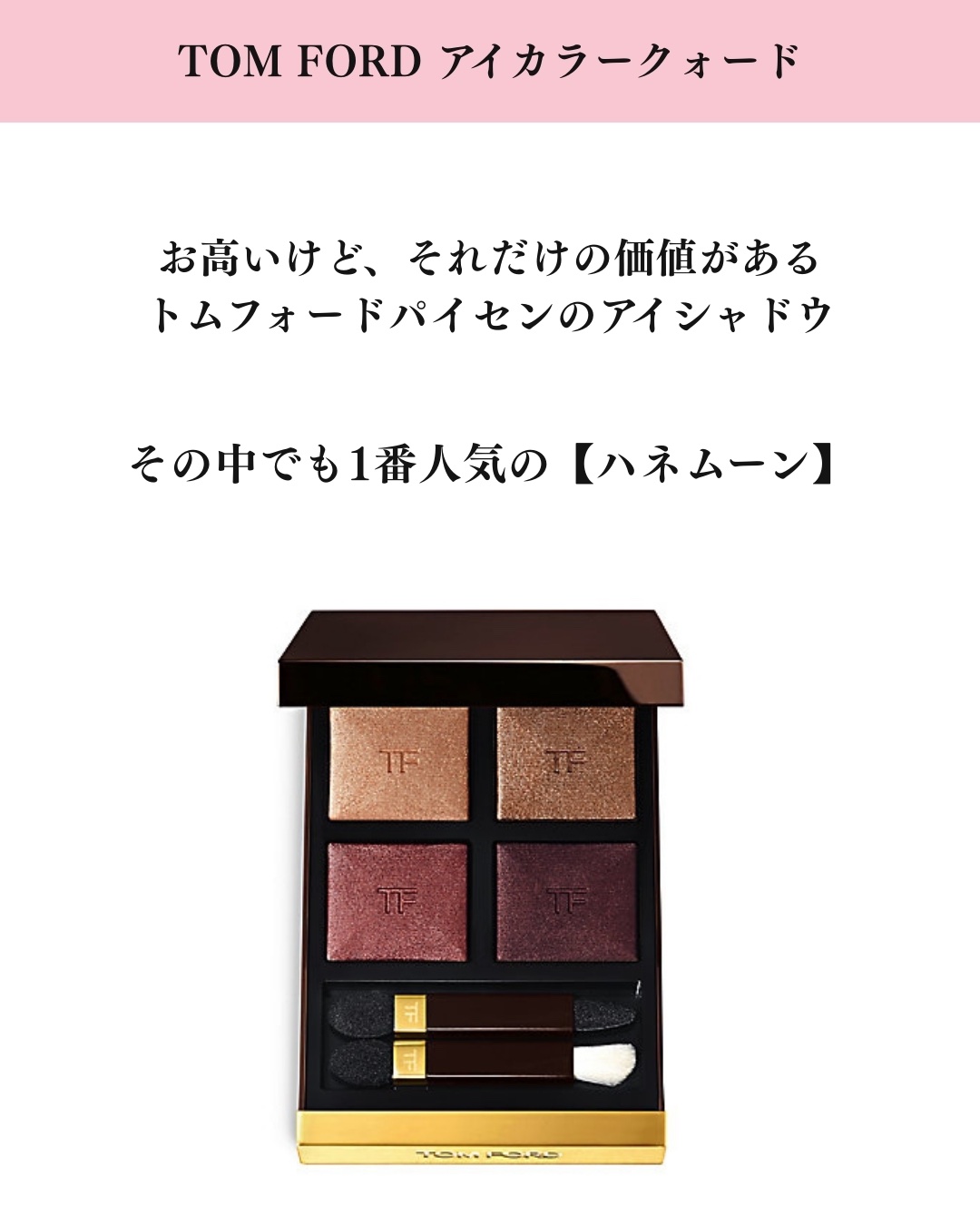 大好きなトムフォードのアイシャドウ✨ ハネムーンは特に上段2色が大好きです🥰 4色のカラーハーモニーで構成されたアイシャドウ。テクスチャーは見たままの鮮やかな発色と色持ちを演出ます。 シアー スパークル、サテン、シマー、マットが絶妙に配色され、ソフトから濃いルックまで自在に。