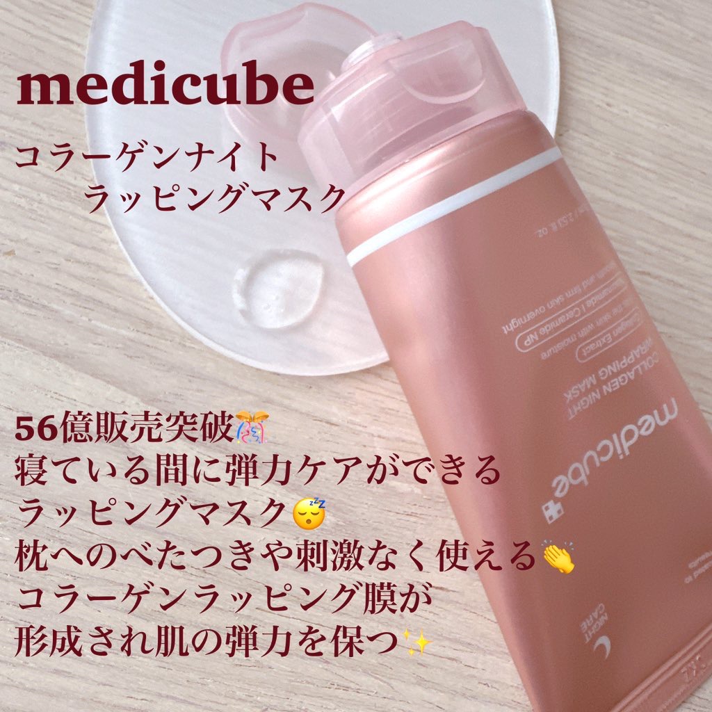 •••メディキューブコラーゲンナイトラッピングマスクむき卵パックで寝ている間にコラーゲンケア🥚寝ている間に枕へのべたつきや刺激なく弾力ケアができるラッピングマスクです♡水のりのようなテクスチャーです*°たっぷり塗ると垂れてきてしまうので薄く伸...