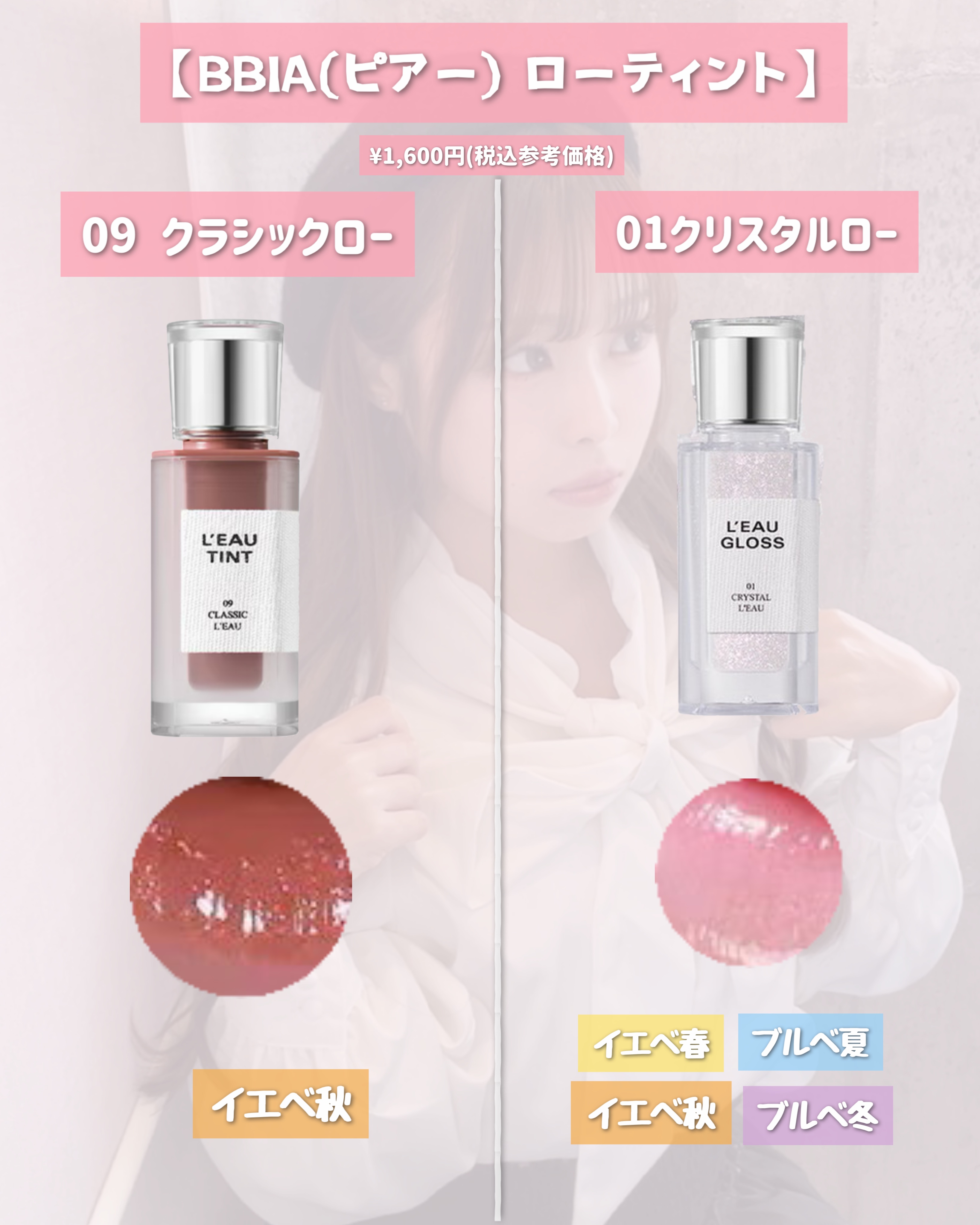 - - うるおいリップなのにしっかりカラーが定着し、時間が経っても塗りたてそのままのカラーを維持 *色が落ちにくいことから「飲み会リップ」としてSNSで話題に - 水のように軽くて快適なグロウティント、塗り重ねるほど鮮やかで透明に浮き上がる水彩画カラー - 香水瓶をイメージしたBBIA初のカスタムデザイン。パッケージはもちろん、カラーとテクスチャーに真心を込めて開発