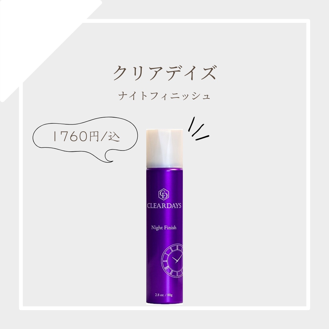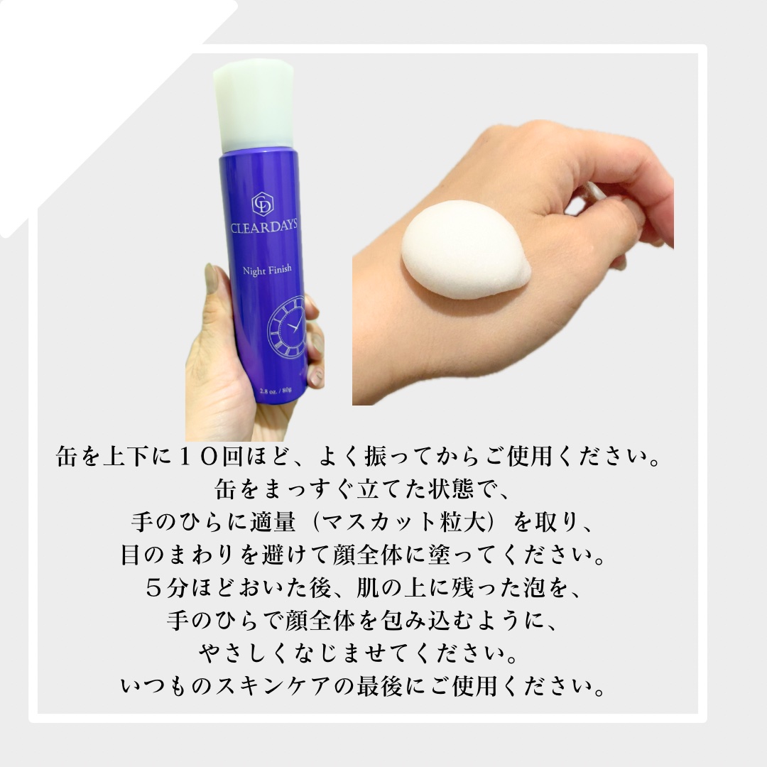 洗い流さないタイプのスリーピング炭酸泡パック 〝クリアデイズ ナイトフィニッシュ〟です。 美容成分たっぷりなクリーミーな炭酸泡が、なめらかに肌を包み込み、じんわりと優しく角質層の隅々まで浸透。 ドリームハーモニーの香りもリラックス効果を発揮して、心地よい眠りをサポートしてくれますよ。