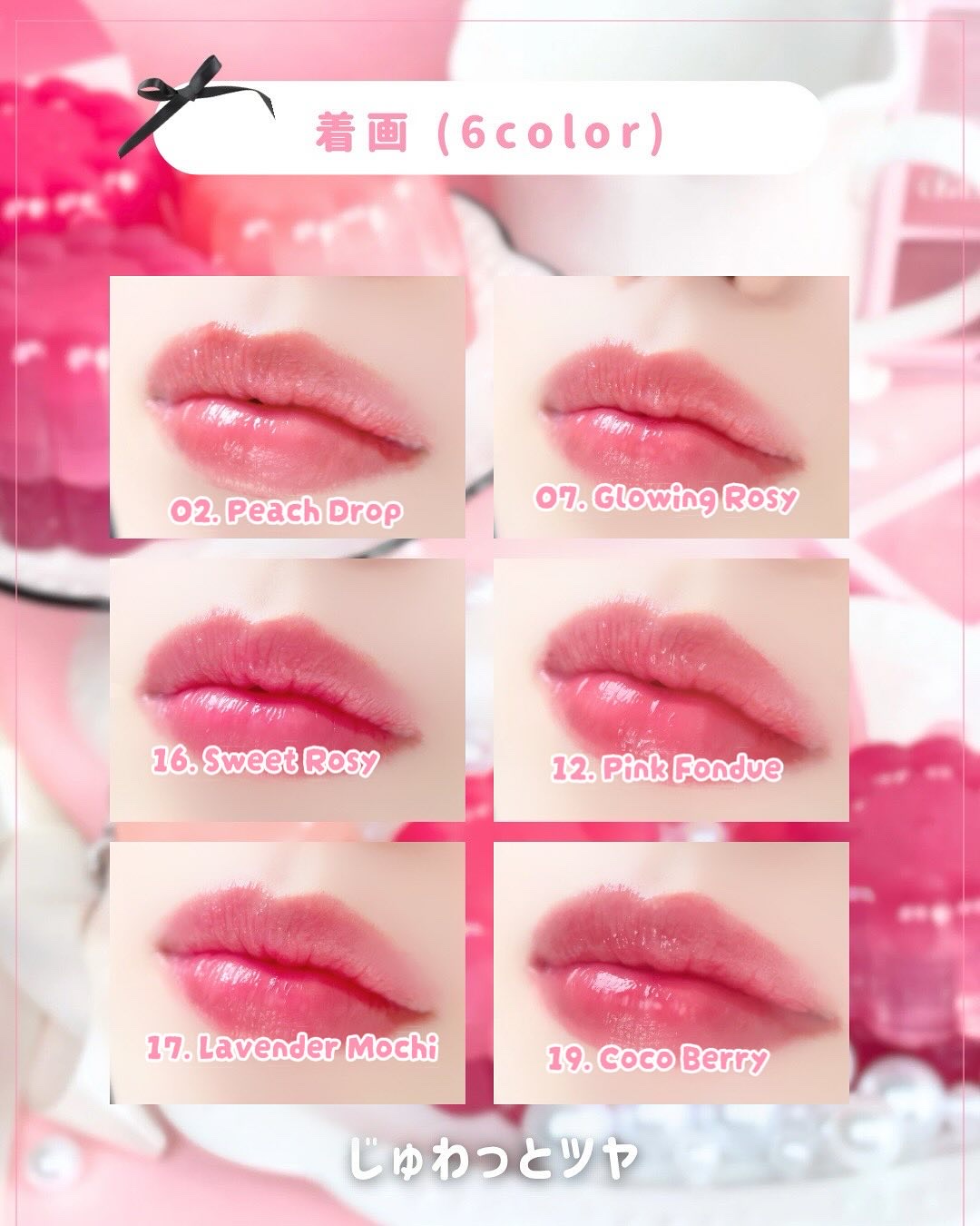 - プリンのような新感覚のチューイングテクスチャーに澄んだカラー感が加わったリップ&チーク。 ぷるぷるとしたゼリーのようなツヤ感が唇と頬にほのかに染まるウォーターリーグロウリップ&チーク。 甘いプリンのようにぷるぷるとした新感覚のチューイングテクスチャーで、べたつかず、なめらかに密着し唇にしっとりとした保湿感を与えます。 イエベ、ブルベの自分の肌トーンごとに使いやすい20色の多彩なカラーバリエーション、透明感のある澄んだカラーと鮮やかな発色、重ね塗りすればするほどあふれ出す、ほのかな水光リップへ導きます。 可愛いプリンのようなラブリーなパッケージで持ち運びが簡単!パッケージの中にはミニブラシが付いていて、衛生的に使えます。 ※ふんわりとしたゼリーテクスチャーの特徴により、固まりが生じることがありますので、薄くレイヤーを重ねて十分に塗り伸ばしてください。
