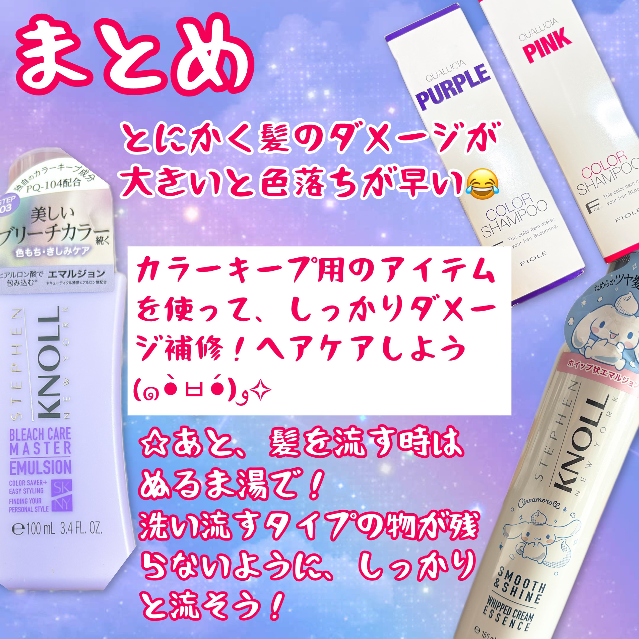 画像&詳しくまとめレビュー版です。セルフブリーチ記録✍️ビフォアフです。クオルシアカラーシャンプー●パープル⭕️⭕️⭕️色の出方が読みにくい。ブリーチが進んでる部分には紫色が強く出てしまう🥹●アッシュ⭕️⭕️⭕️⭕️⭕️良いです。まさにアッシ...