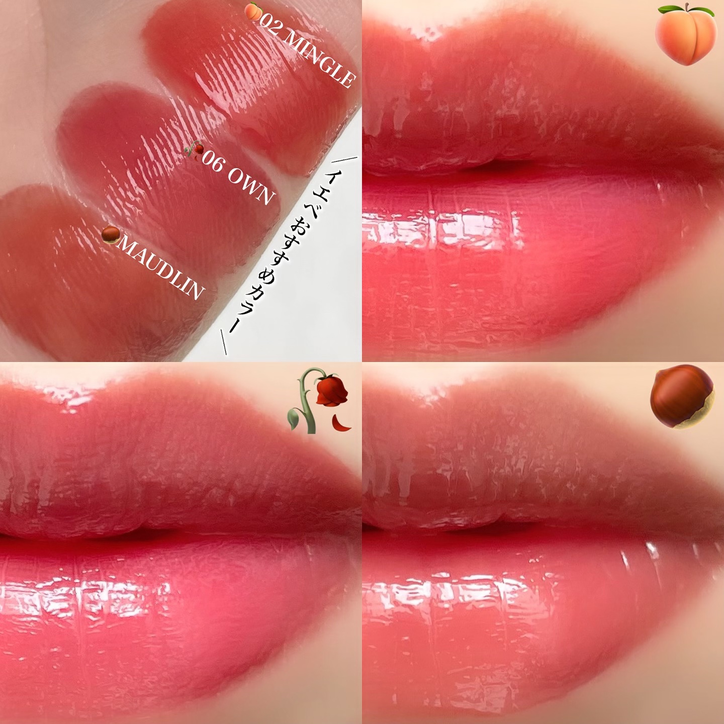 世界初の成分アプローチ🪄で 唇をこすり合わせずにじっと待つと(5分ほど) 透明ジェル膜がコートしてくれてキレイ色と ツヤが続く新処方のリップティントです💄 ツヤ好きにはたまらない... ちゅるちゅる感がとっても可愛い🥺💓 ツヤ持ちも良くマスク移りもありませんでした👍🏻 ̖́- ただ、私の場合ですが上唇のお山の部分と 中心部分が濃く残ってしまうという落ち方で ムラっぽく見えるのでお直しは必須かな😵💫💡