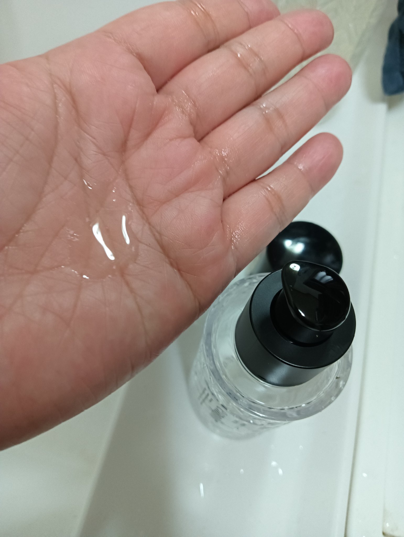 透明感とみずみずしさが、感じられるデザインそのままのテクスチャーです。 500円硬貨大をコットンに含ませ、お肌に馴染ませると、ベタベタしない、本当にサラサラした【水】が感じられます。 肌に馴染み、お肌がぷるぷるとしたイメージで、ずっと自分の肌を触りたくなる良い感触(ㆁᴗㆁ✿) 紫外線を浴び、ピリつく肌にもエアコンで乾燥した肌にも、優しく潤うのがお気に入りっ。 テカリやすく、皮脂過多な夫も気に入って使っていますよ。