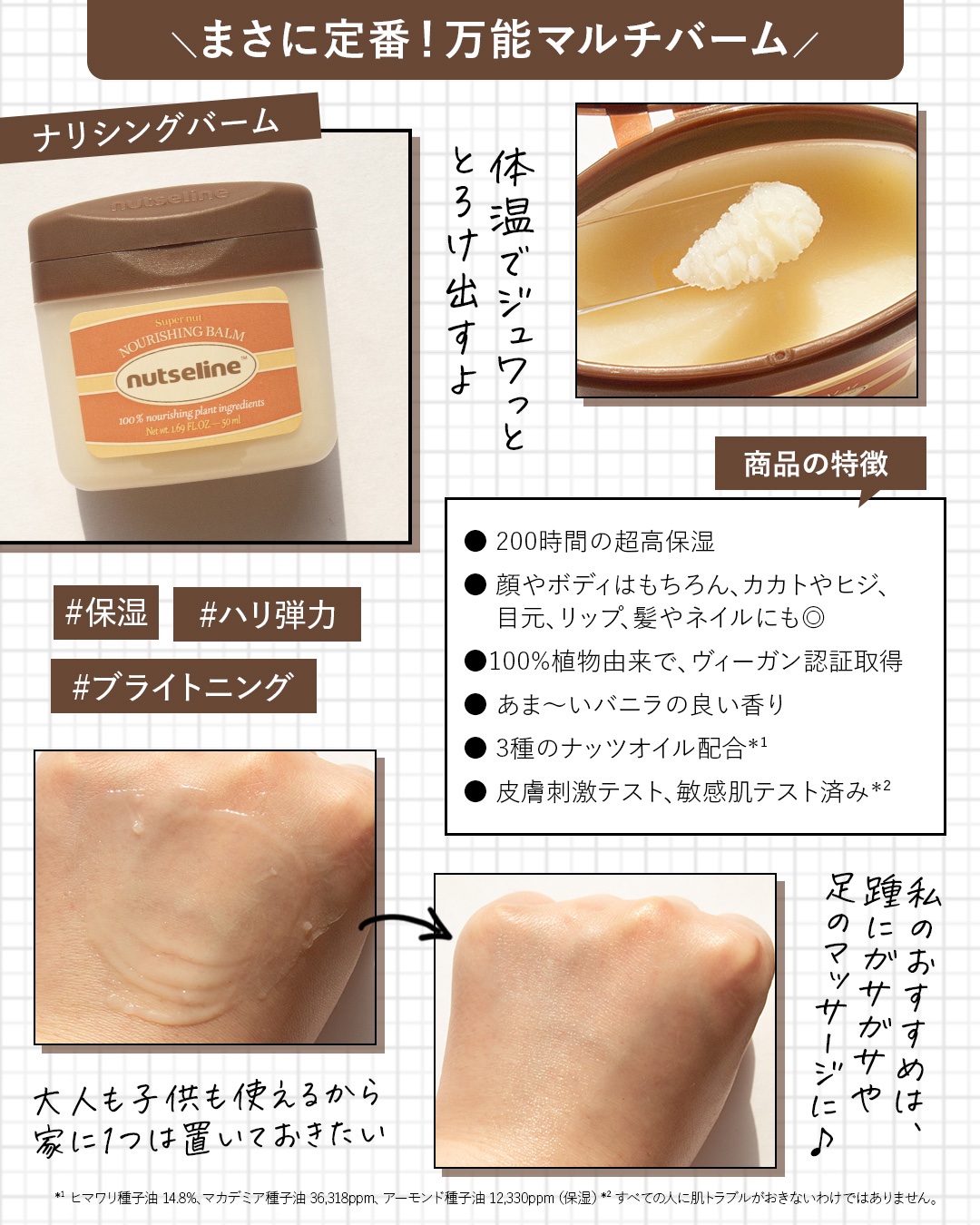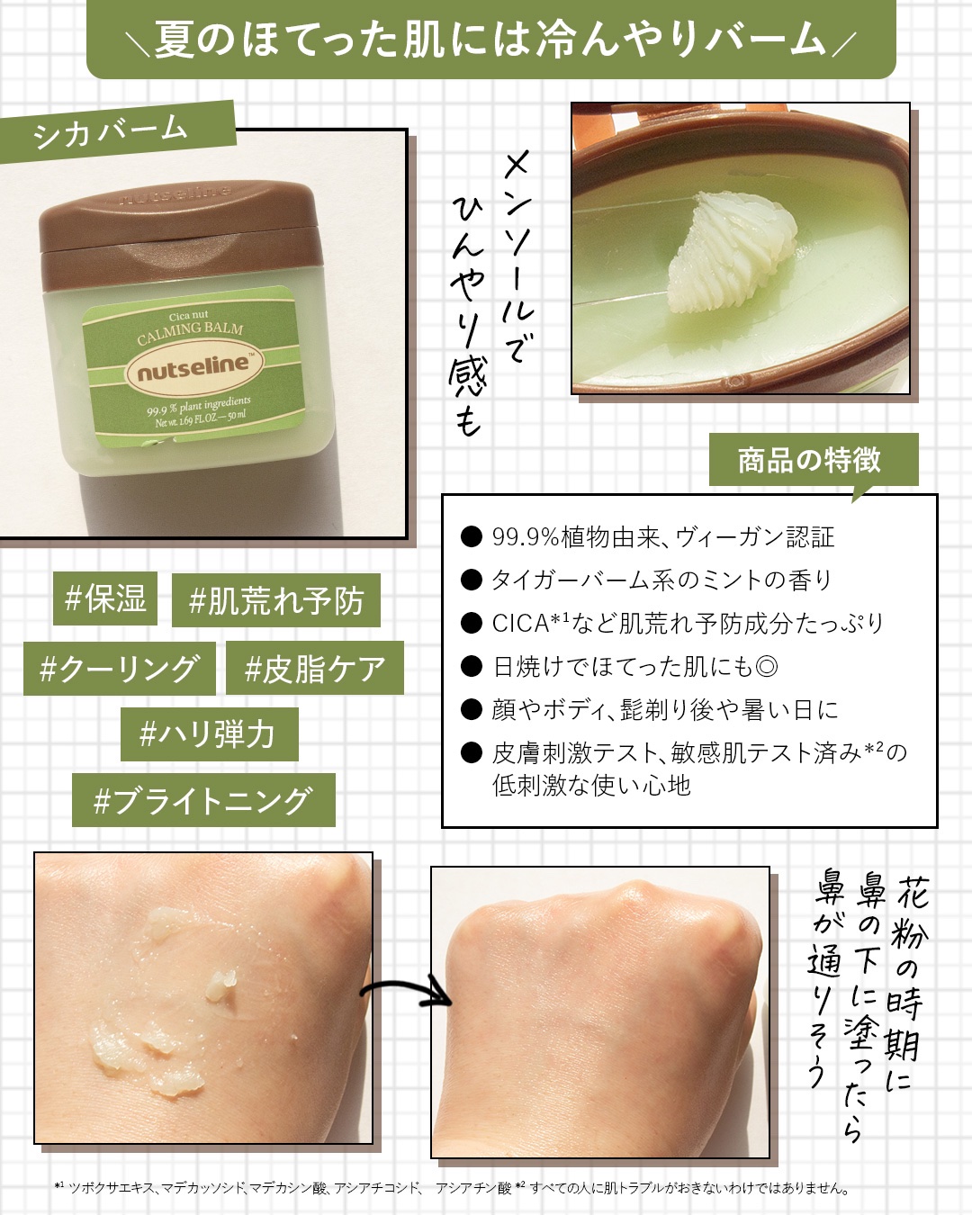 肌の皮脂と似た構造の植物由来オイルが配合してい自然に馴染み、潤いを与える 3つのナッツオイルを使用しているそうです💓 手にのせて馴染ませると、とろけるようにバームがとろけて艶と保湿感がすごくあります💓 乾燥したすべての所に200時間保湿との事ですごい持続時間ですよねー‼️🥹 刺激を受けて鎮静が必要な時はこちら💁♂️ シカナッツカーミングバーム💓 ほてった顔、頬、など刺激を受けた肌に毎日刺激を受ける敏感な部位に使えるバーム✨