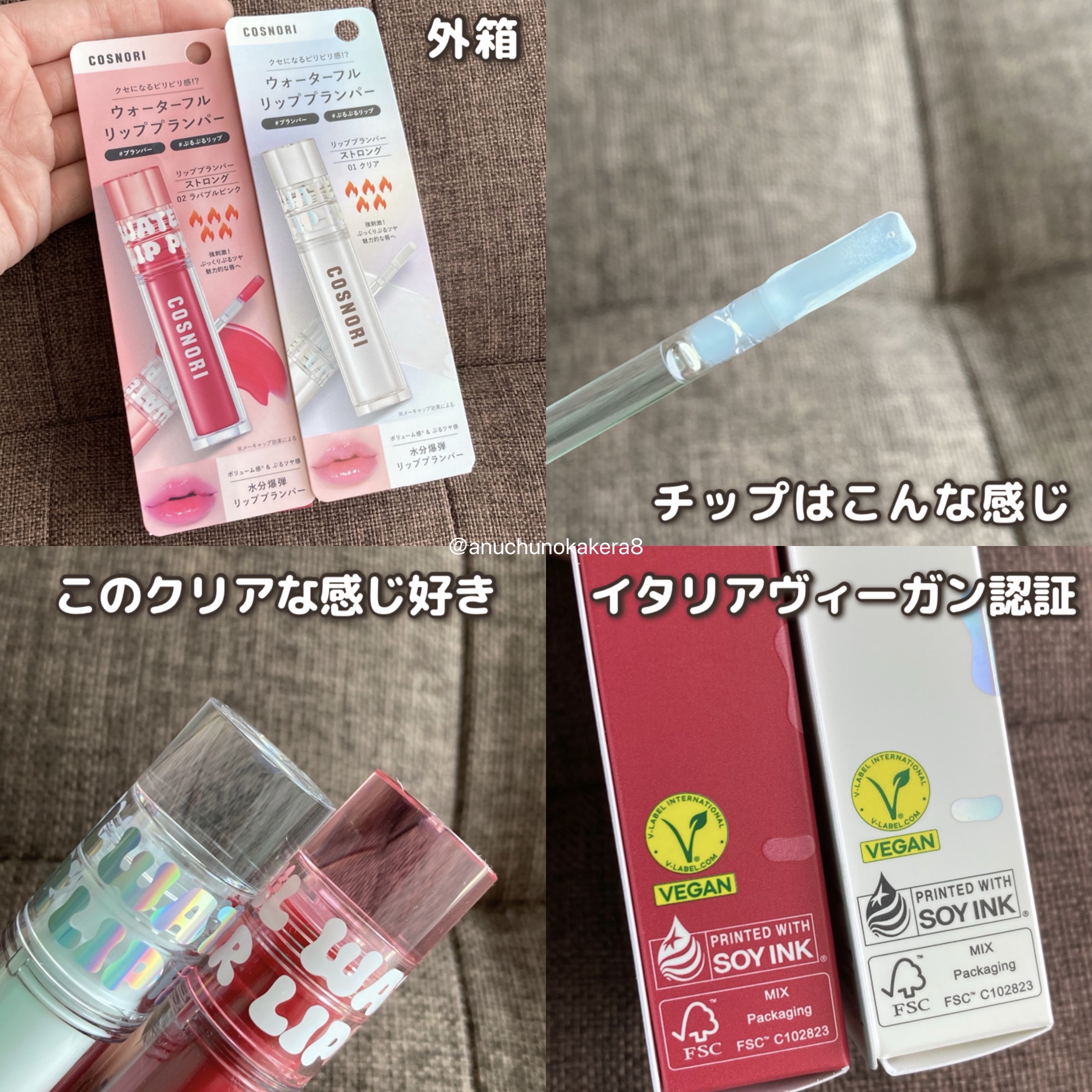 COSNORIウォーターフルリッププランパーストロング01クリアストロング02ラバブルピンク塗った直後からピリッとした痛みが40分くらい続いてかなり刺激強め😳私自身プランパー初心者のためかなり痛みを感じました😹刺激強めなので上級者さん向けかも...