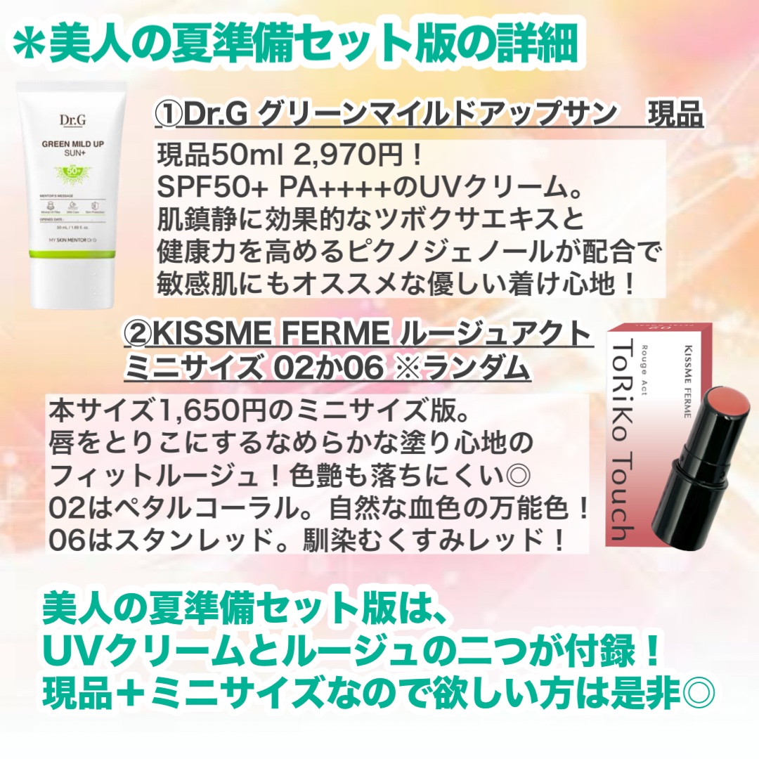 【 お得ーー❣️】久々雑誌を付録買い美的スペシャル増刊930円日焼け止め現品と、リップサンプルDr.Gグリーンマイルドアップサンプラスキスミーフェルムルージュアクト06 スタンレッドリップは2色ランダムシアー感が可愛い!ティッシュオフは残るけ...