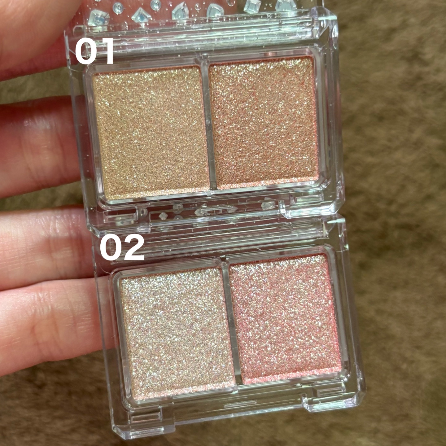 - ※03は2025年11月下旬よりロフト・プラザで先行発売。2026年3月下旬発売予定で2026年4月以降定番導入予定となります。 自分の気持ちを上げる♪ キャンメイク史上最もキラキラ!?ご褒美級ラメシャドウ✨ 高輝度、高密着! ラメ好きさんには是非使ってほしい✨ まるで発光しているかのように輝く大粒ラメアイシャドウです。 他のアイシャドウの上から重ねても濁らない 透明度の高いラメで、美しい輝きが楽しめます。 まるでラメの膜が張るようにぴたっと密着! ラメ飛びしにくく、キレイな仕上がりが長時間続きます。 【同系色の2色入り】 左:カラーレスメイクや、淡いアイシャドウに合わせやすいラメ 右:ほんのりベースカラーが発色する、華やかなカラーラメ