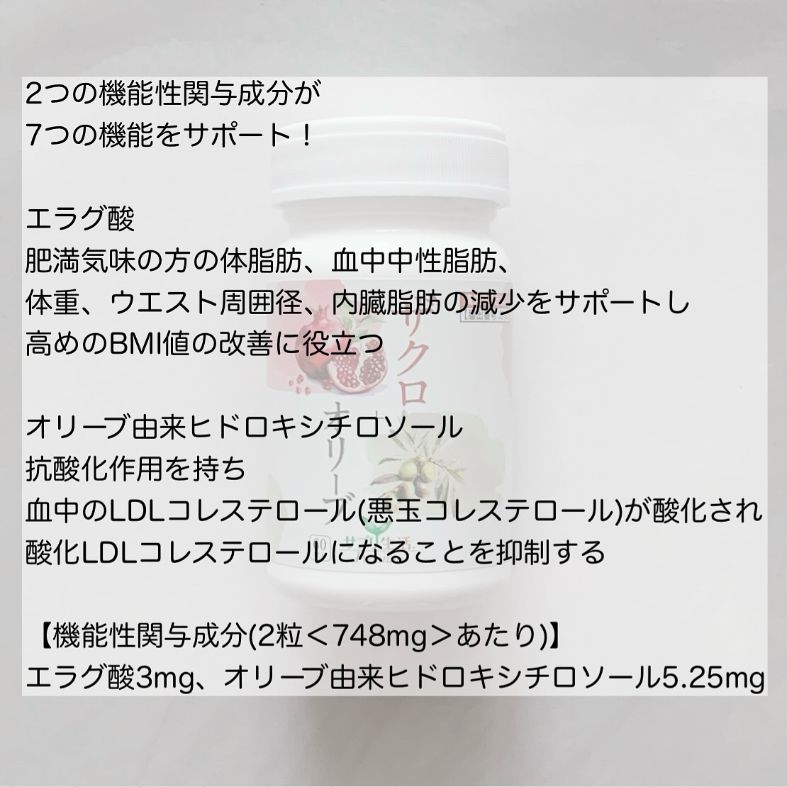 さぽらいふさまからいただきました💗..地中海の恵みを詰め込んだ『ザクロ+オリーブ』。エラグ酸が体脂肪やウエスト周囲径の減少をサポートし、高めのBMI値の改善を助けます。外食することが多い私のお供として飲んでいます☺️#モニター#サプリメント#...