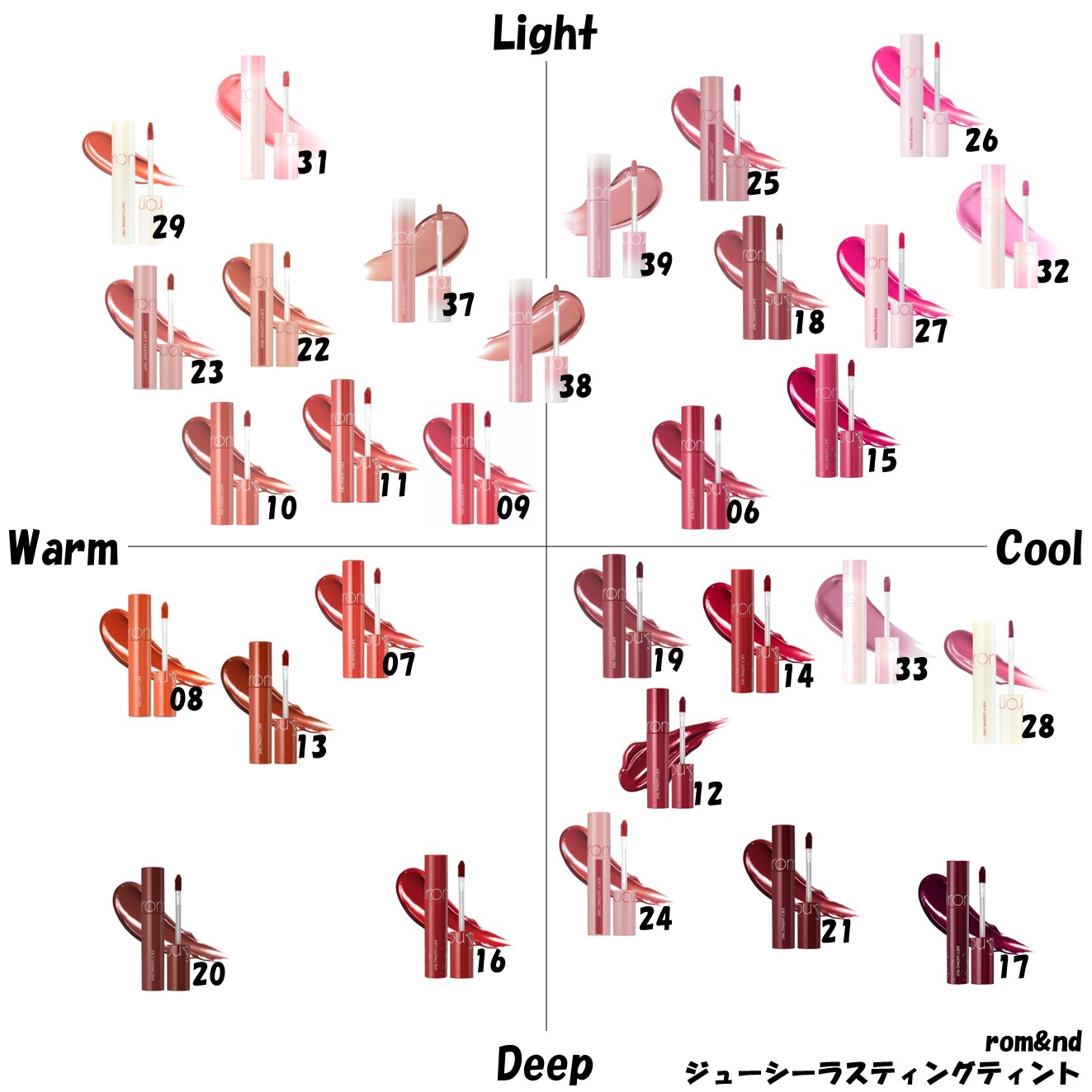 rom&ndザ ジューシーラスティングティント1200円+税✼••┈┈••✼••┈┈••✼••┈┈••✼••┈┈••✼全色スウォッチとカラーチャートです!お買い物の参考にしてください💗✼••┈┈••✼••┈┈••✼••┈┈••✼••┈┈••✼...