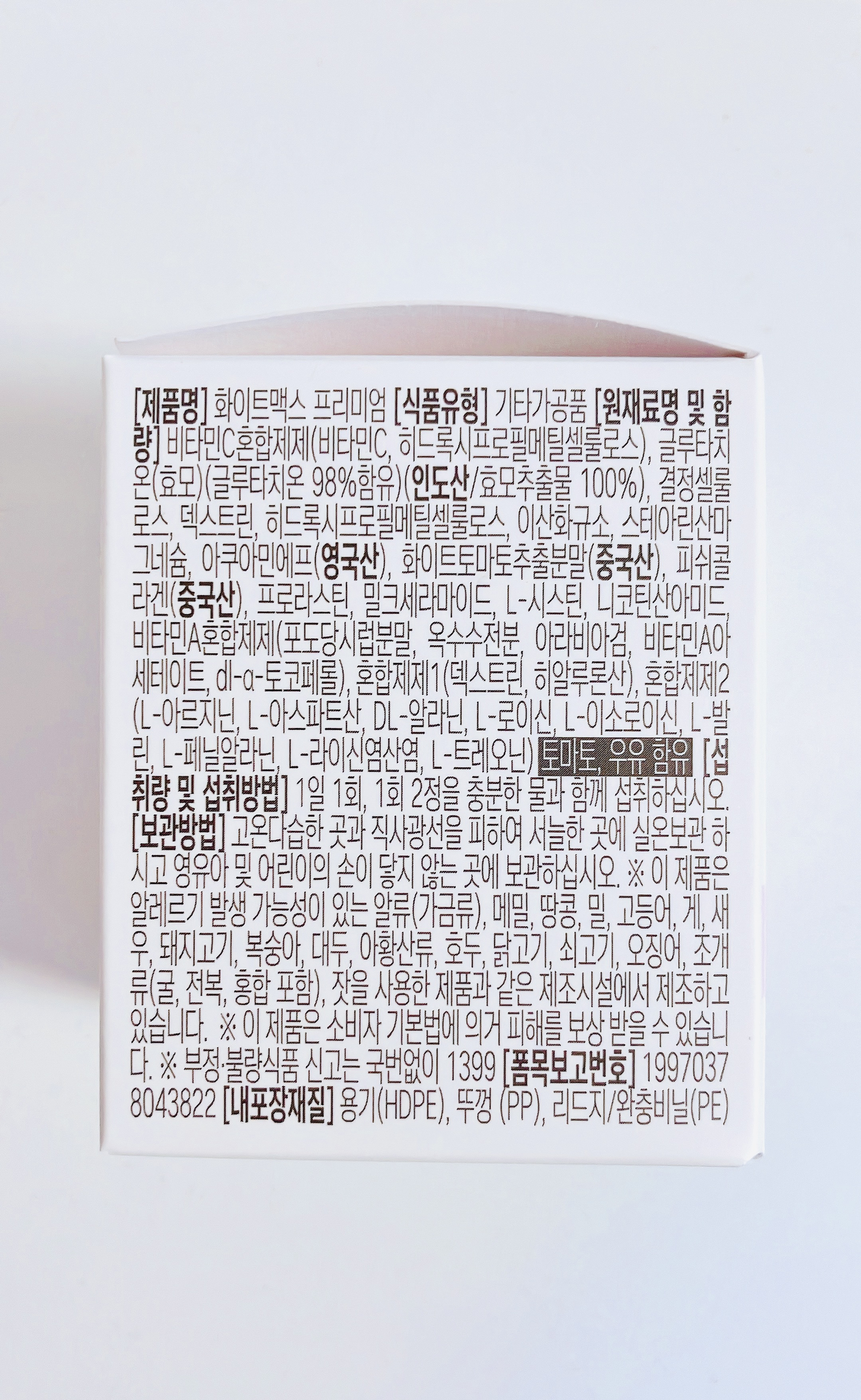 - 「本物のキレイ」のためのホワイトマックスプレミアム! 98%高純度グルタチオン400mg、上質な原料のみを詰めました。 さらにL-シスチン、ビタミンC、ホワイトトマトエキス、ナイアシンアミド、ミルクセラミドまで 計6つの成分をバランスよく配合し、内側から美容をケアします。 1日2錠目安、水と一緒に摂取してください。